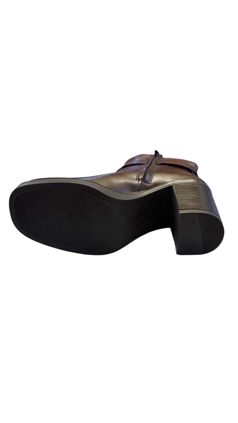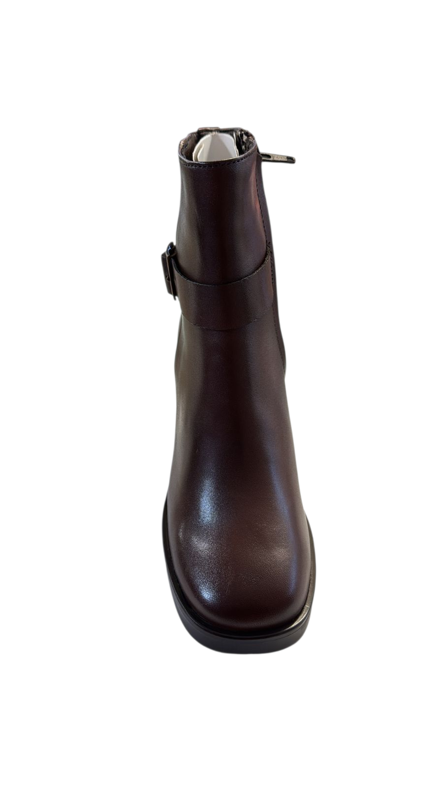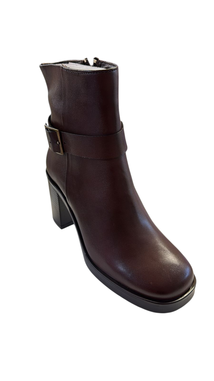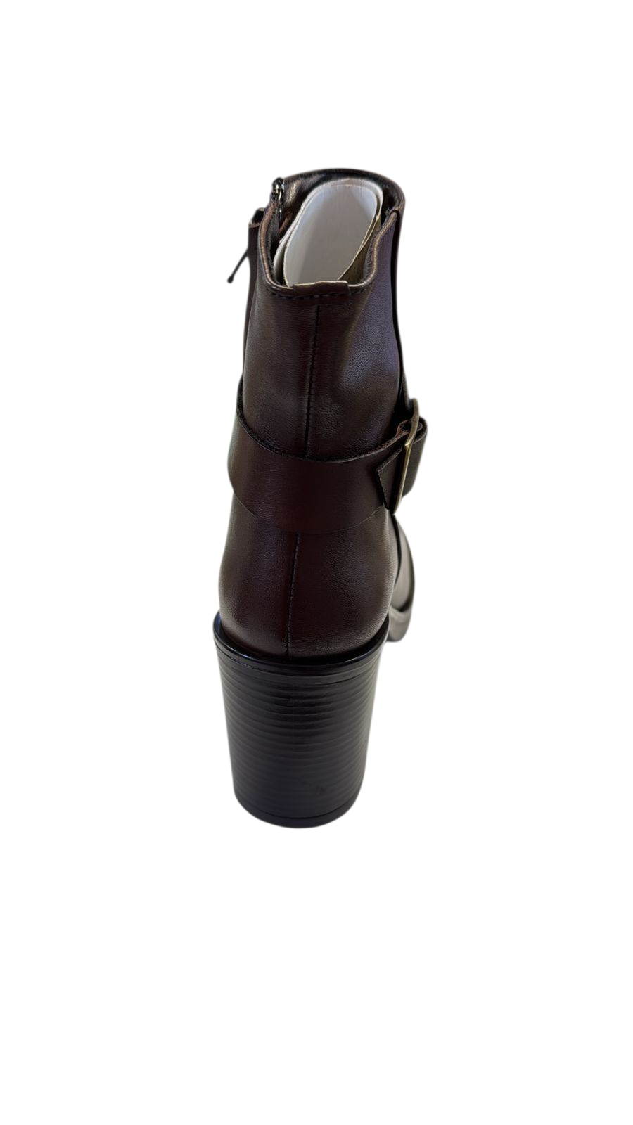 Bota para dama de piel muy suave en color café con detalle de broche a un costado y cierre al otro, tacón Sintético.