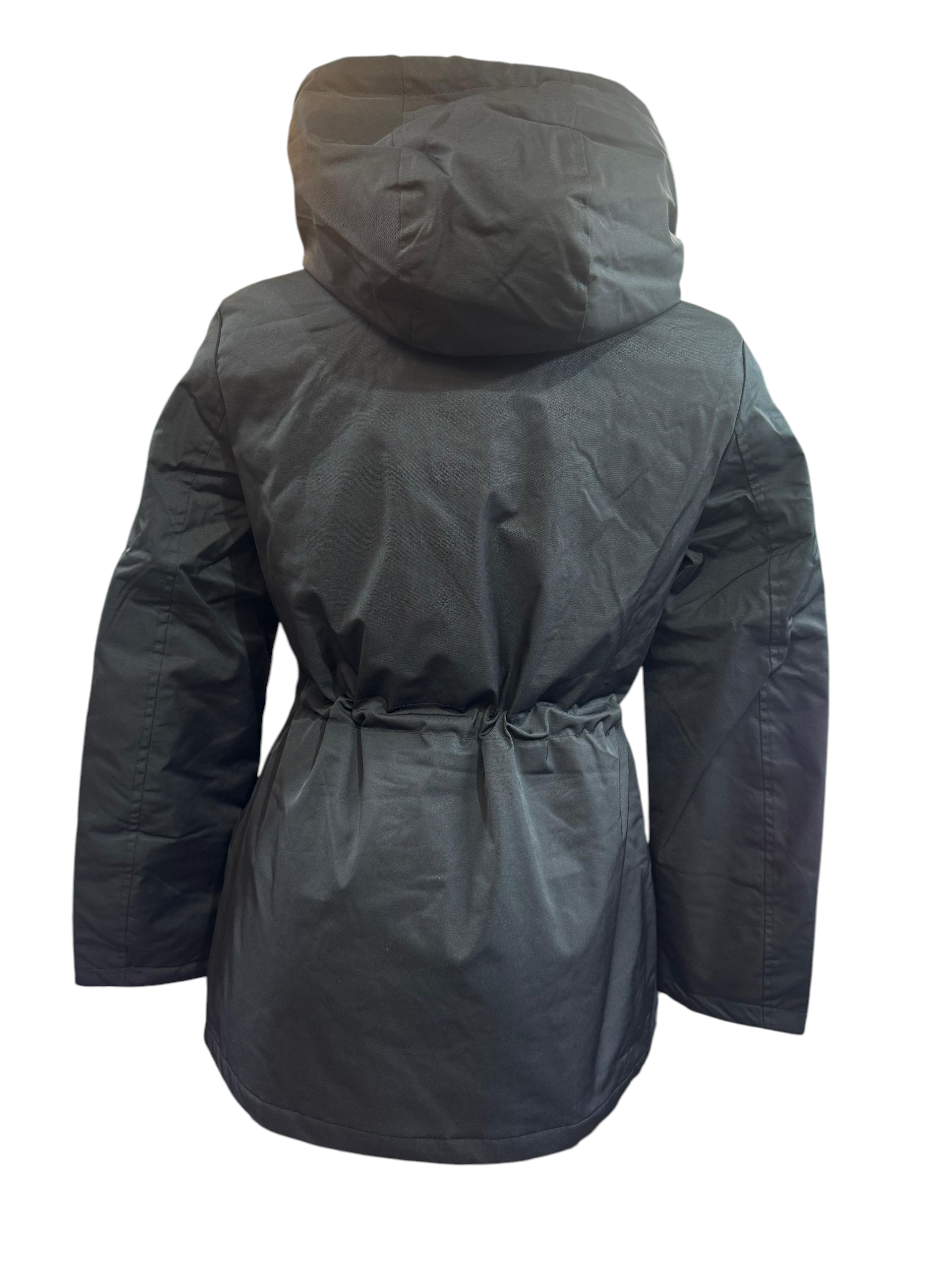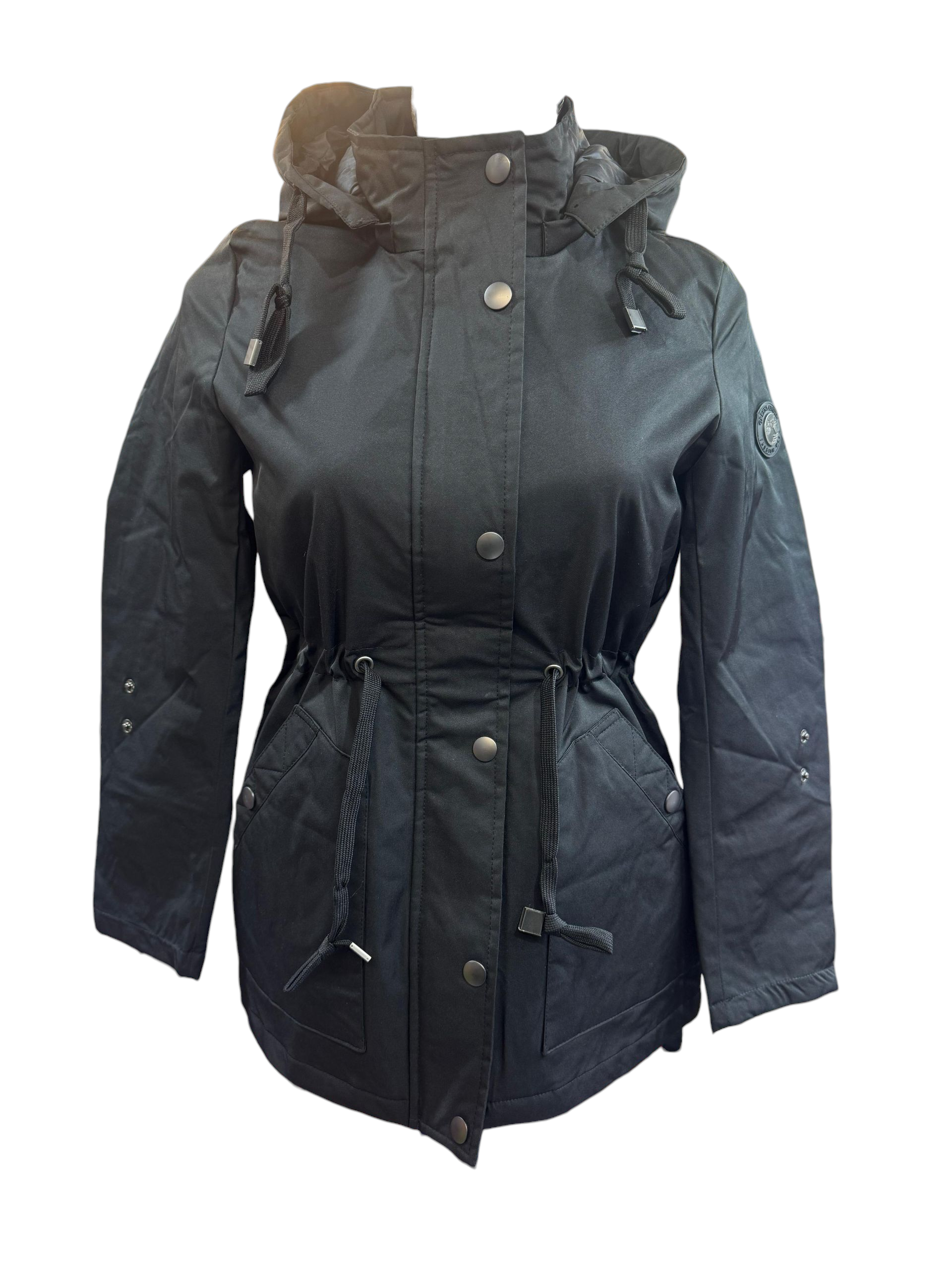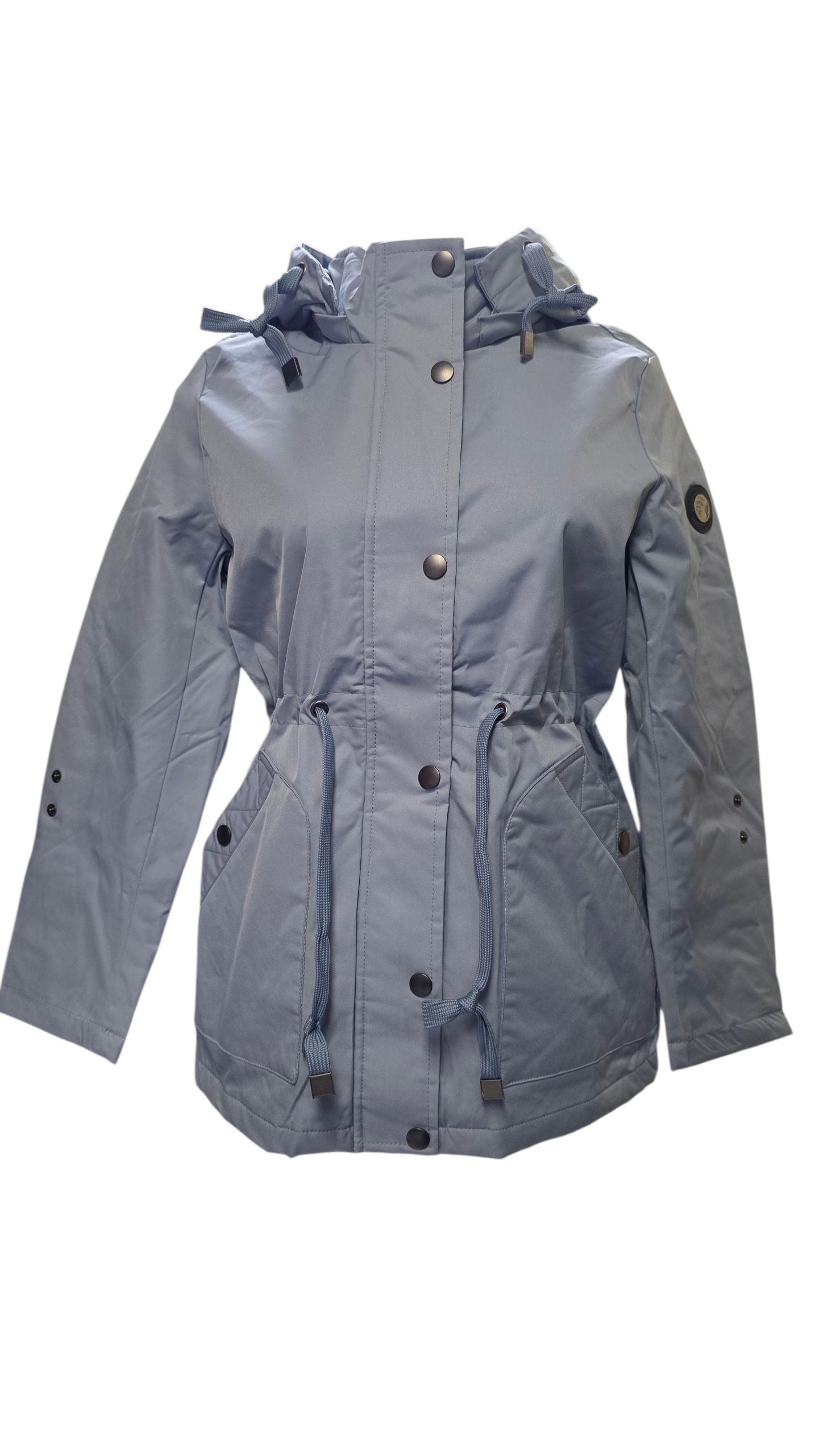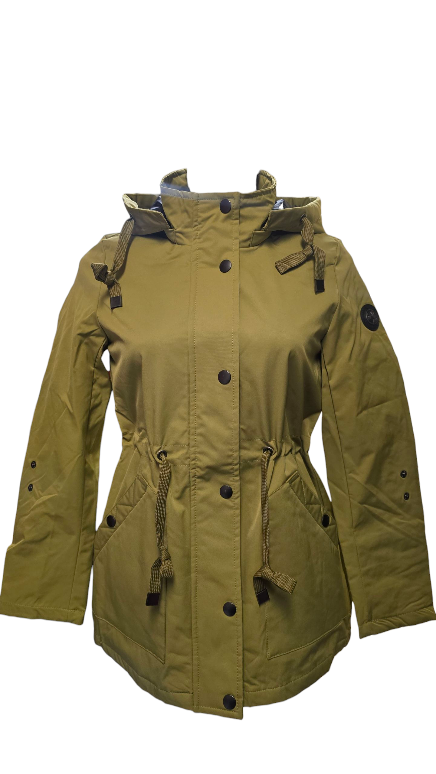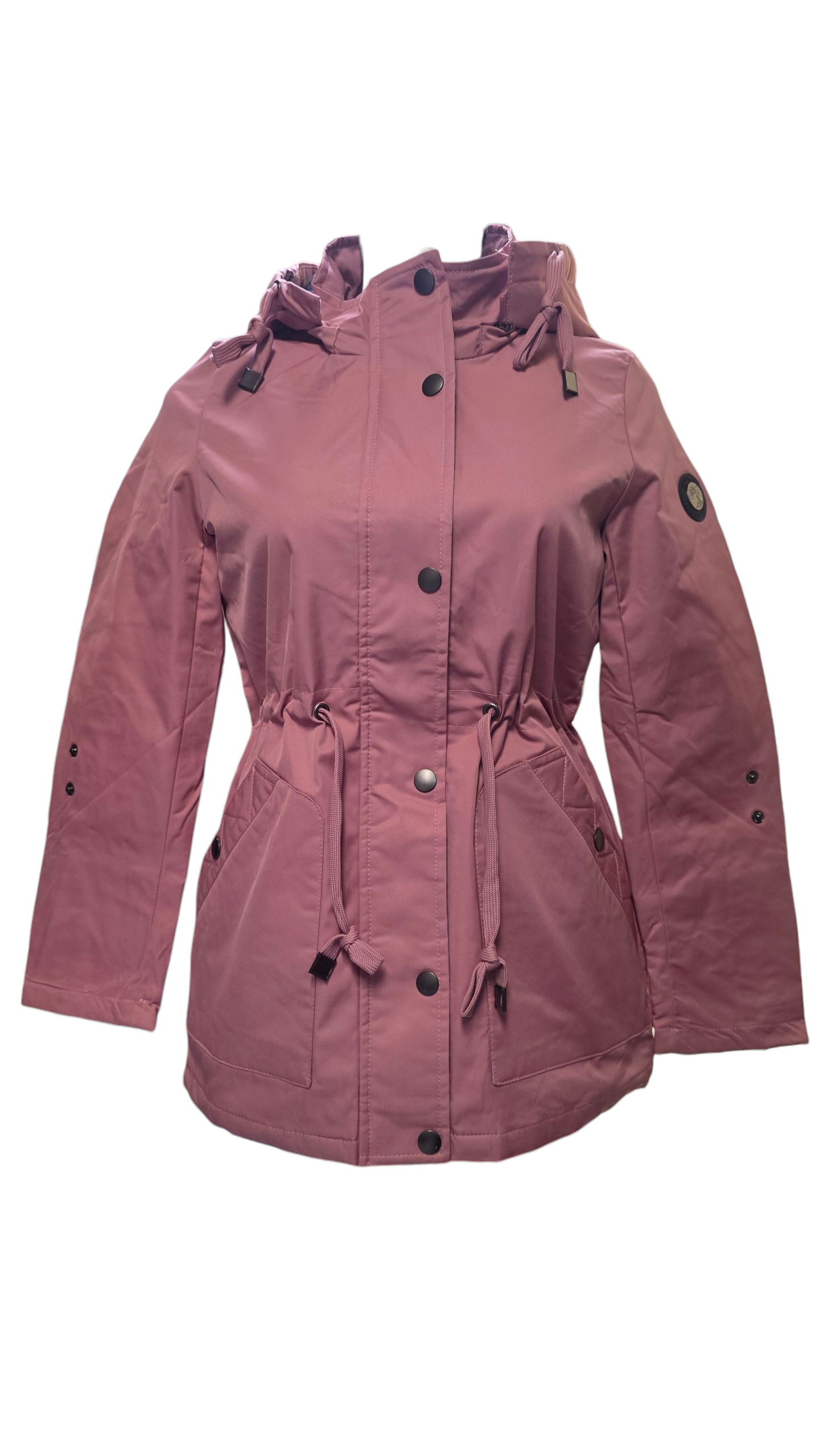 Chamarra para dama con gorro ajustable , botones y cierre al frente, cinta ajustable en la cintura y bolsillos a los costados
