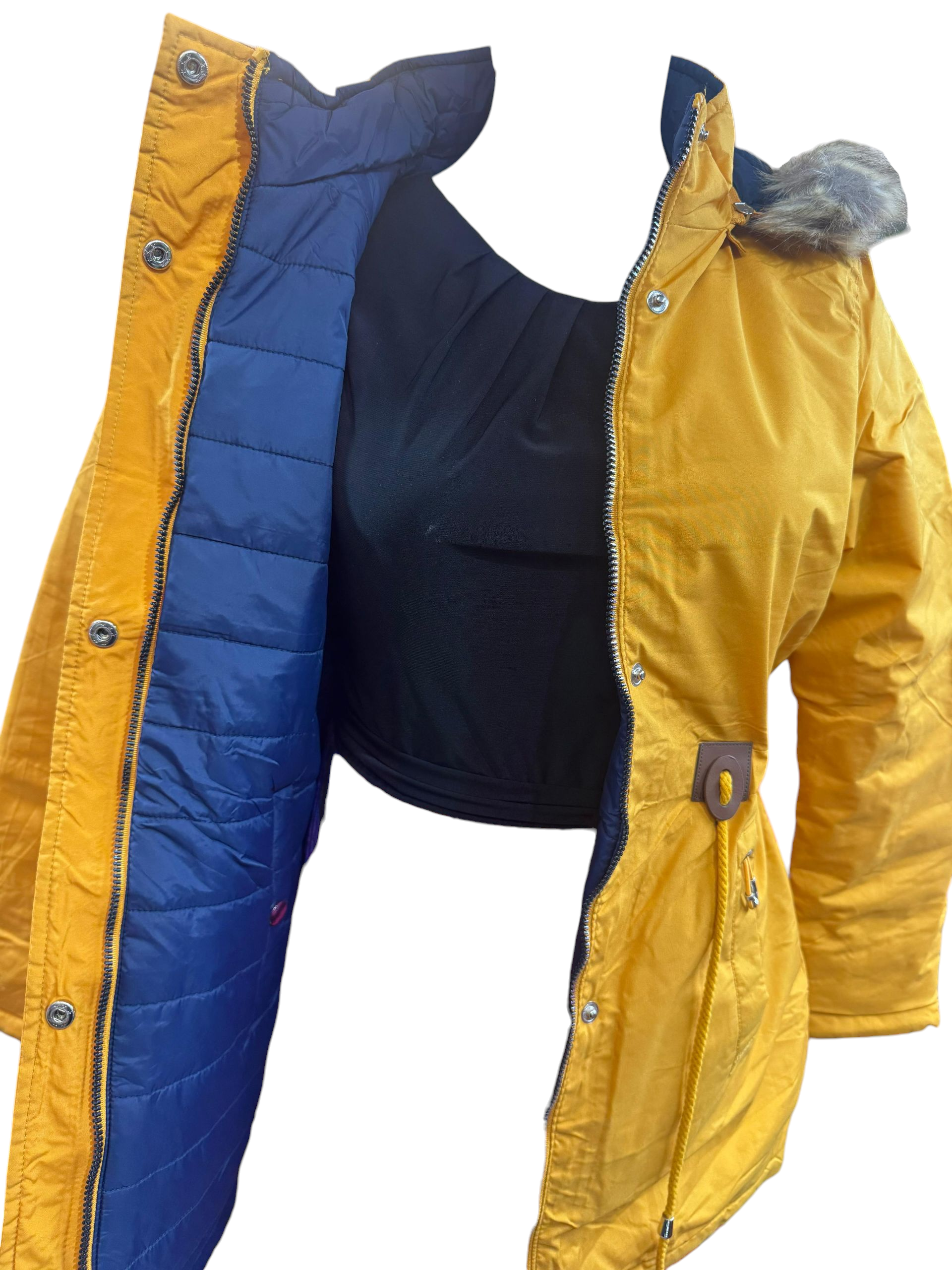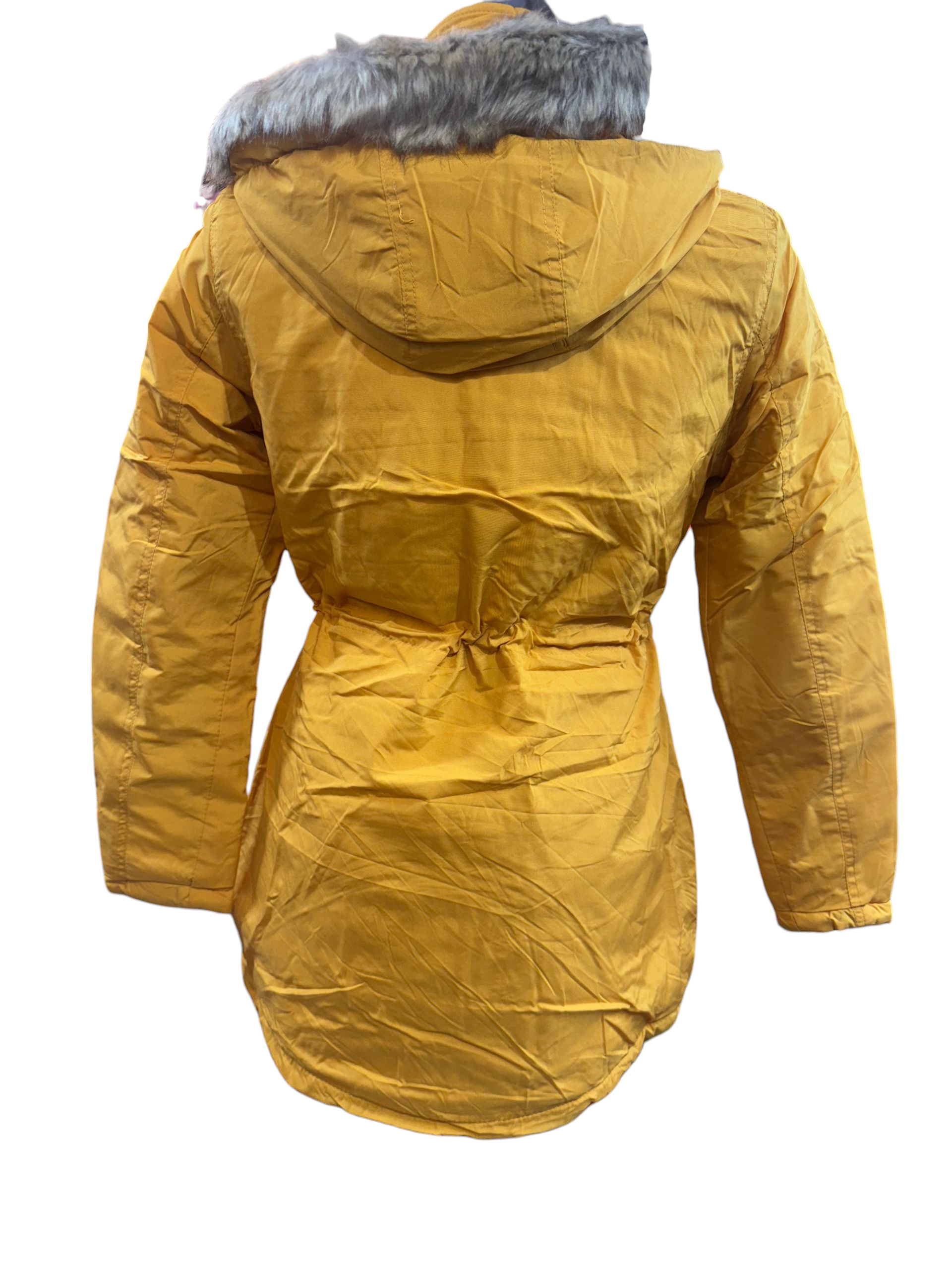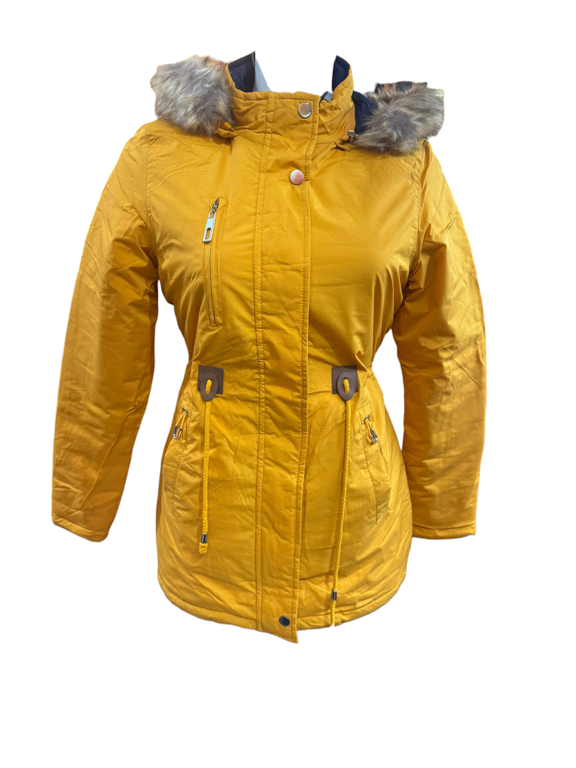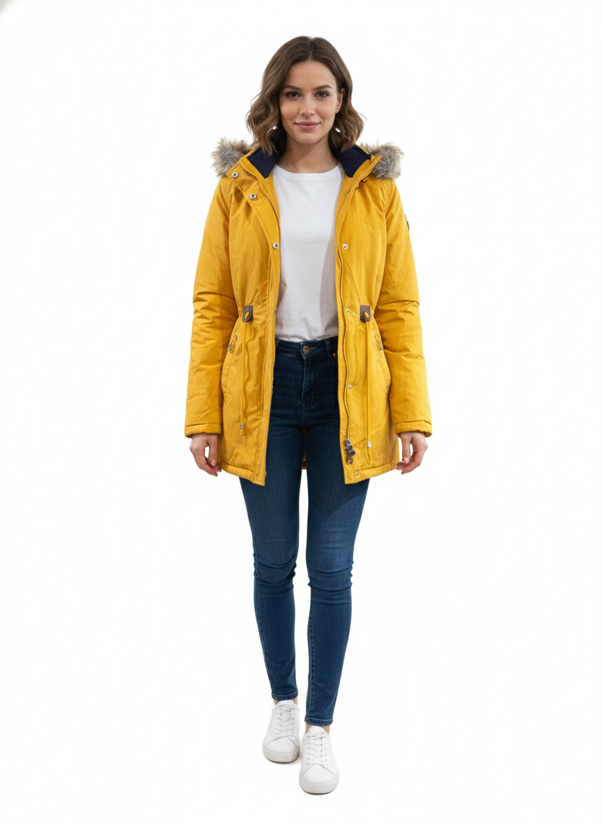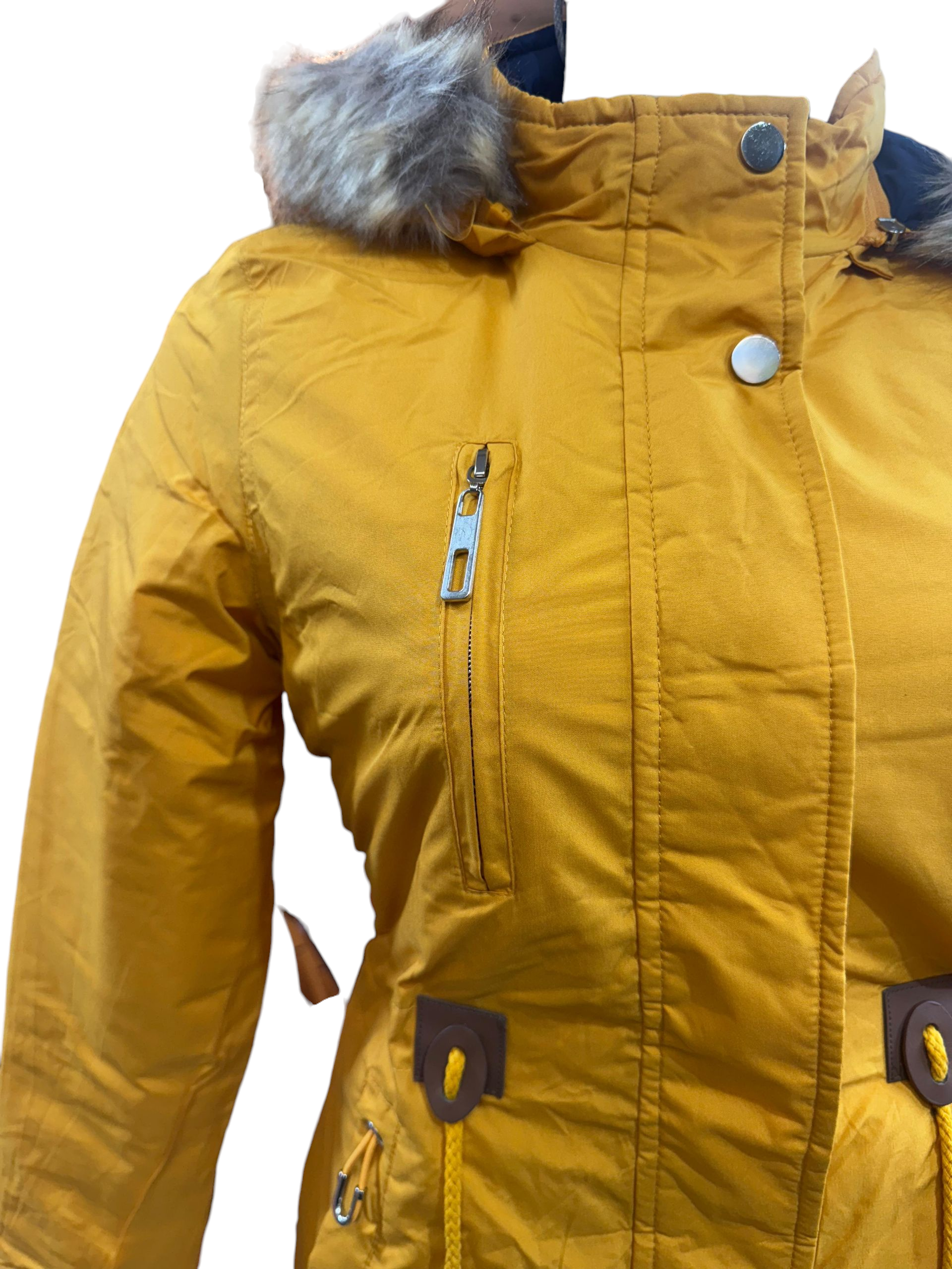 Chamarra para dama con gorro desmontable, bolsillos a los costados y en el pecho, cierre y botones al frente y cinta ajustable en la cintura