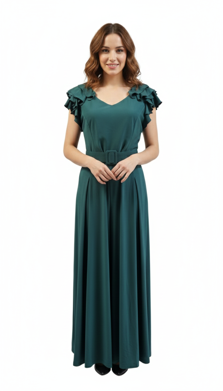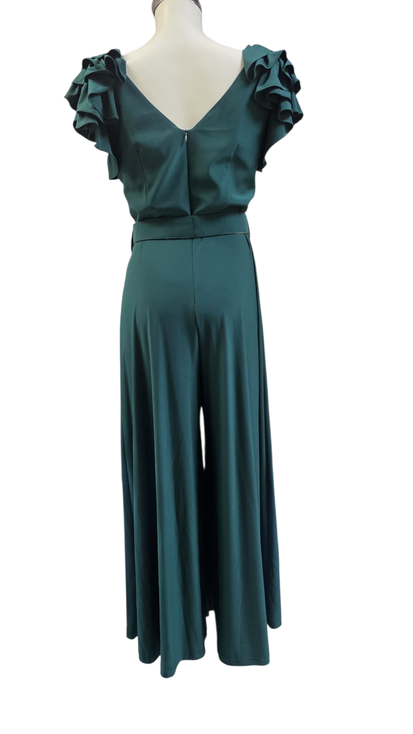 Palapzo para dama en cuello V , olanes en los hombros , cierre oculto en la parte de atrás y cinturón a juego.