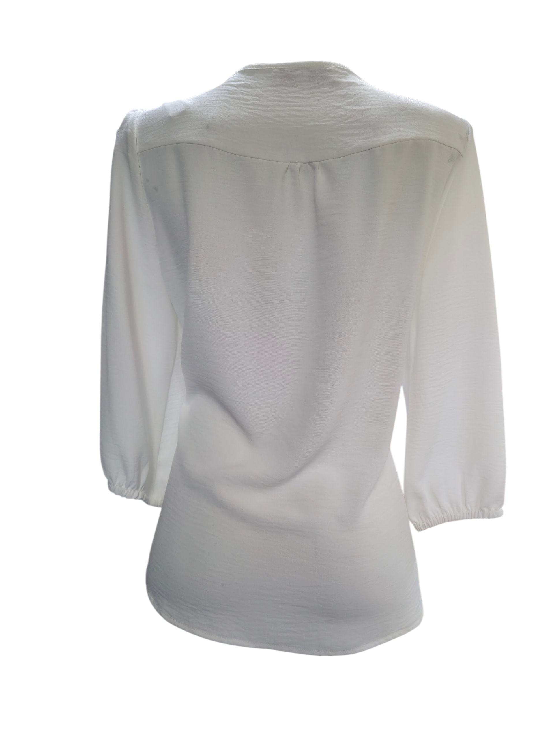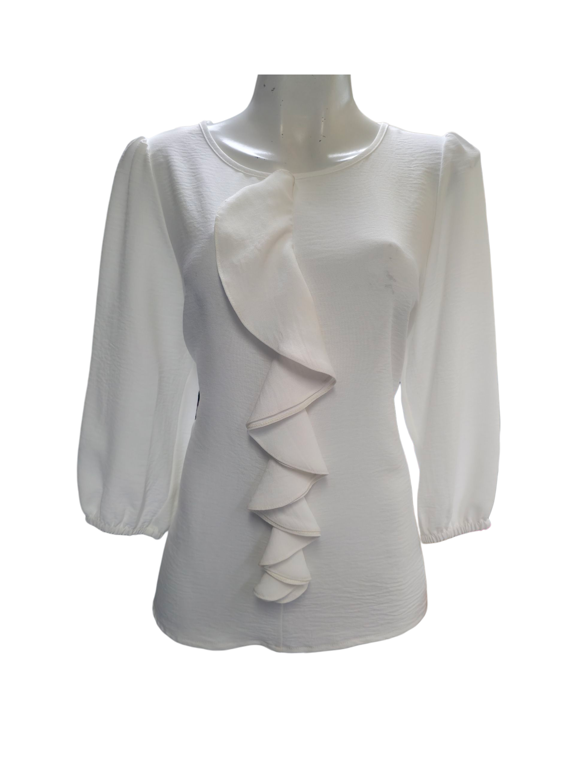 Blusa de dama en tono hueso, manga larga con resorte en los puños y con un olan largo al frente.