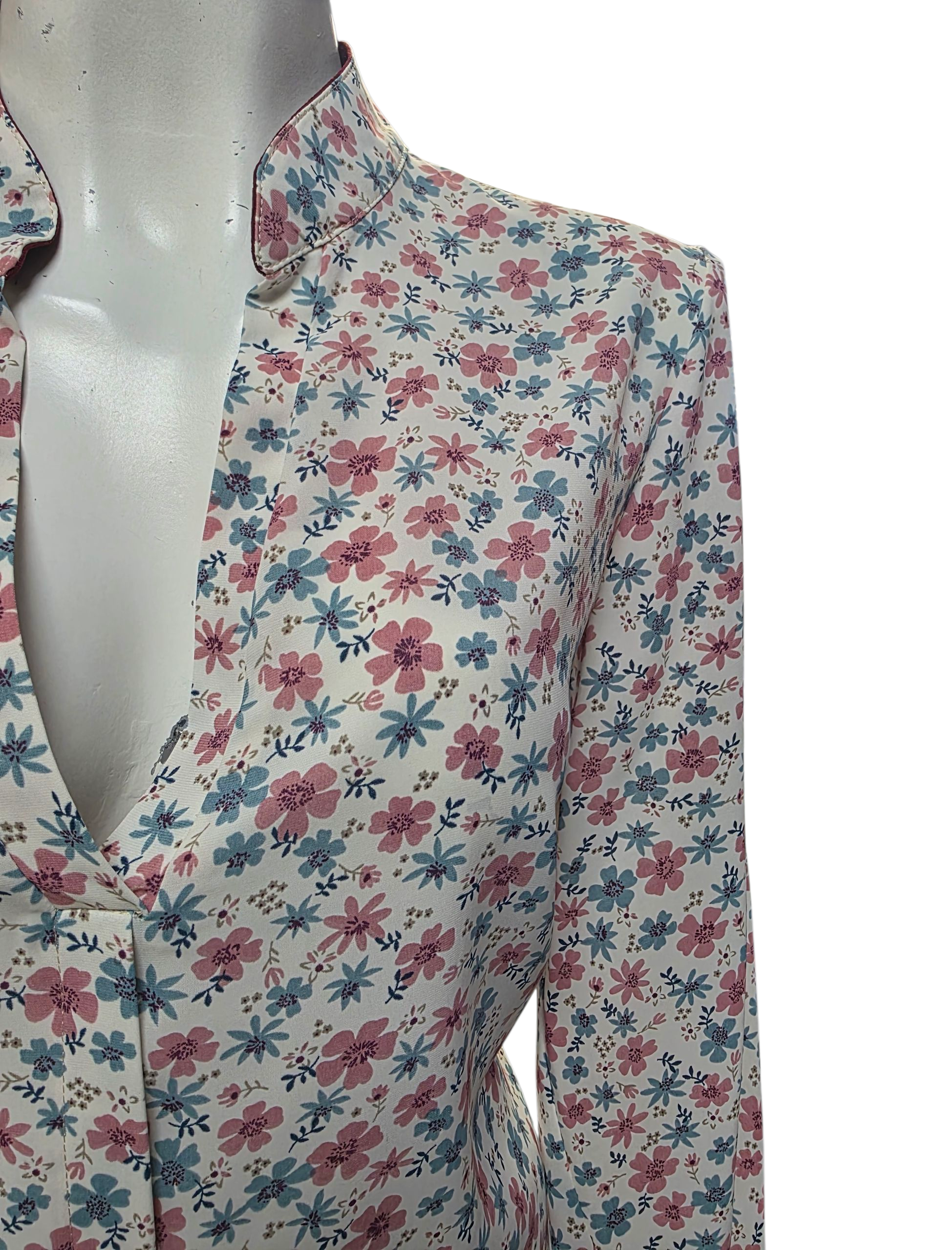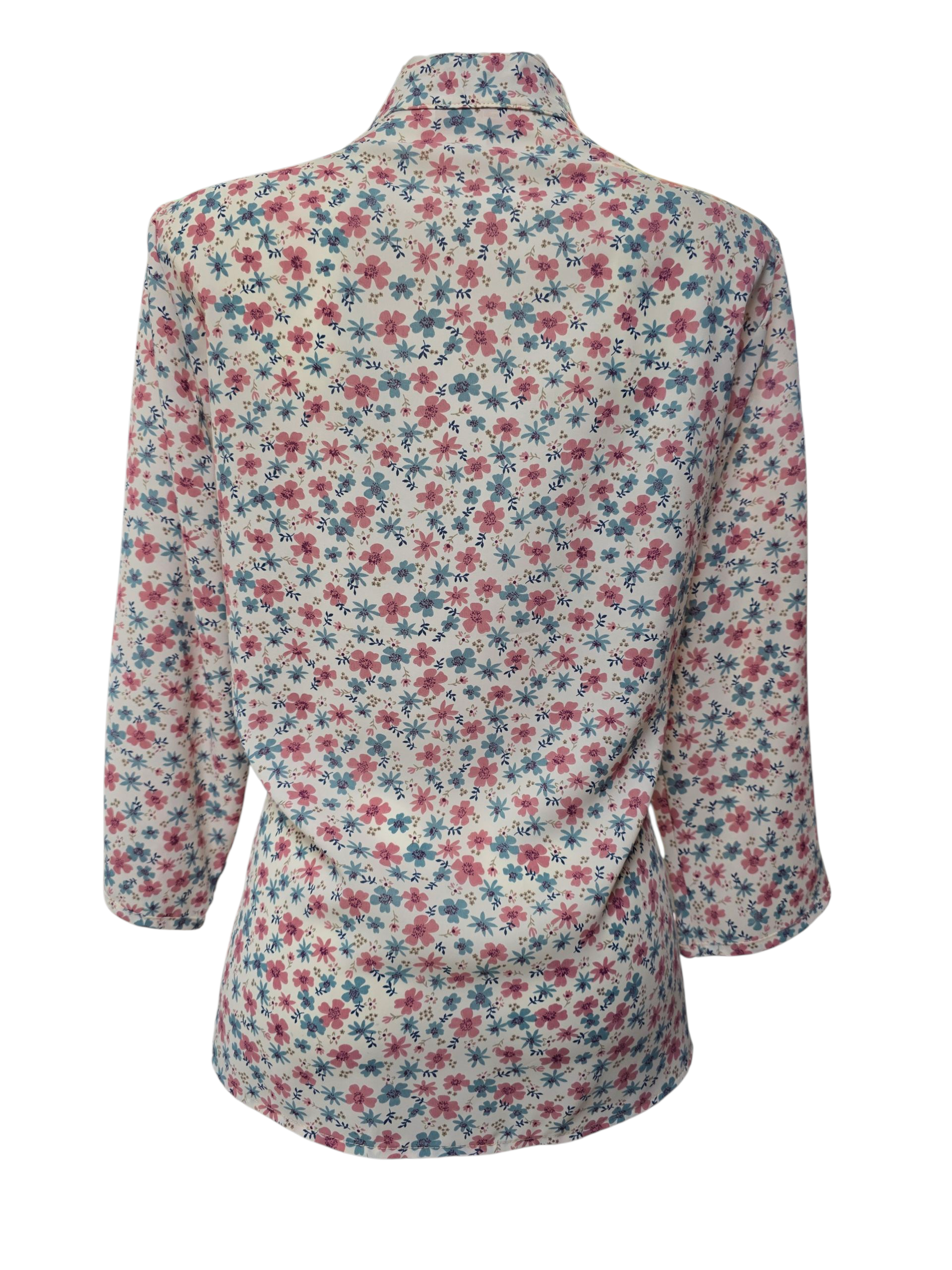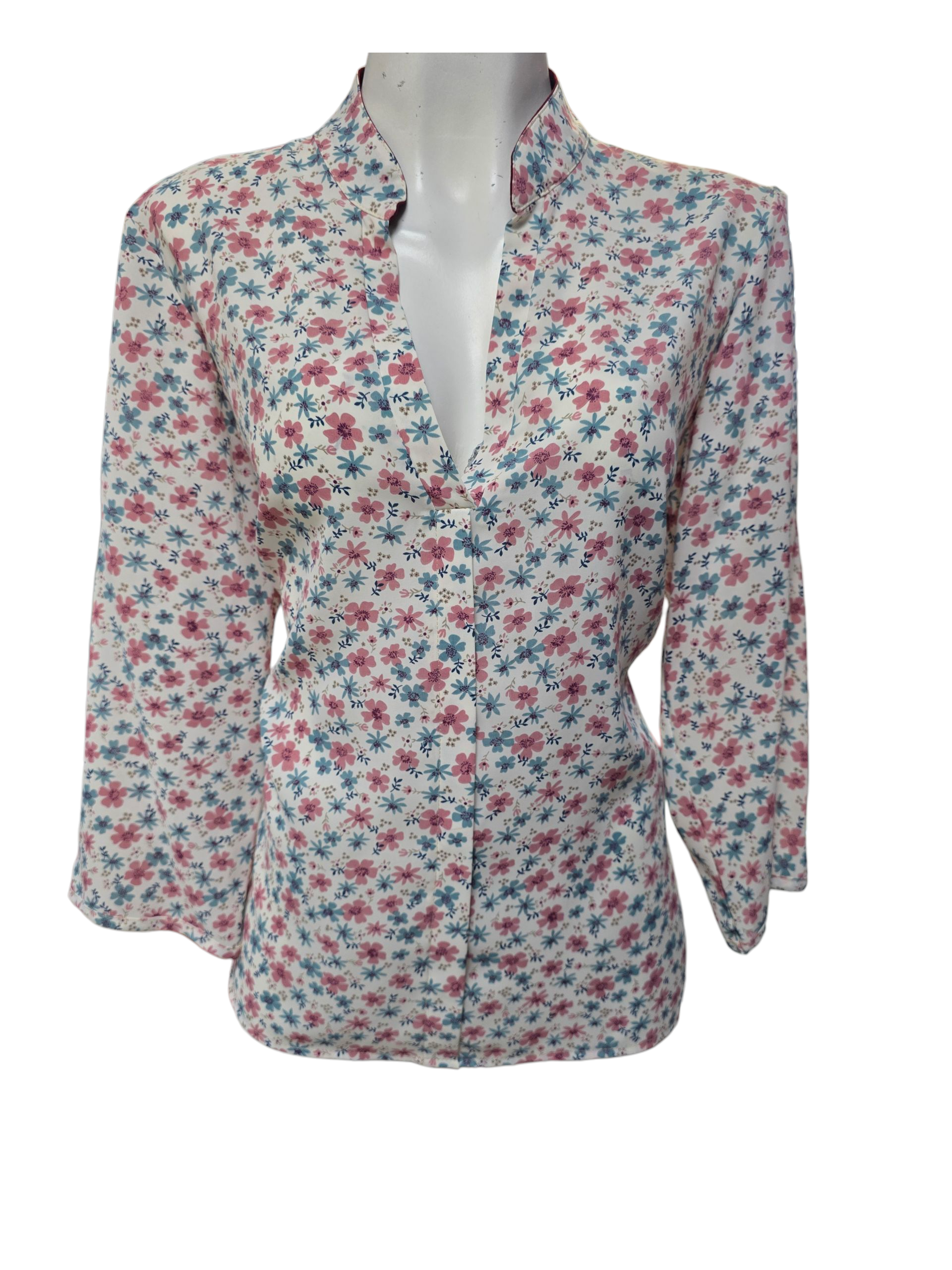Blusa de dama en cuello V con botones, diseño de flores rosa y azul , manga larga.