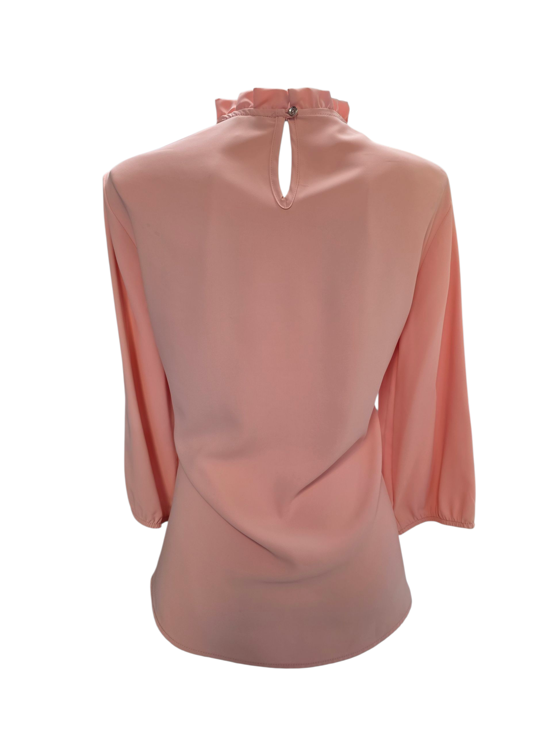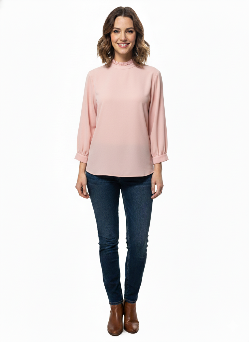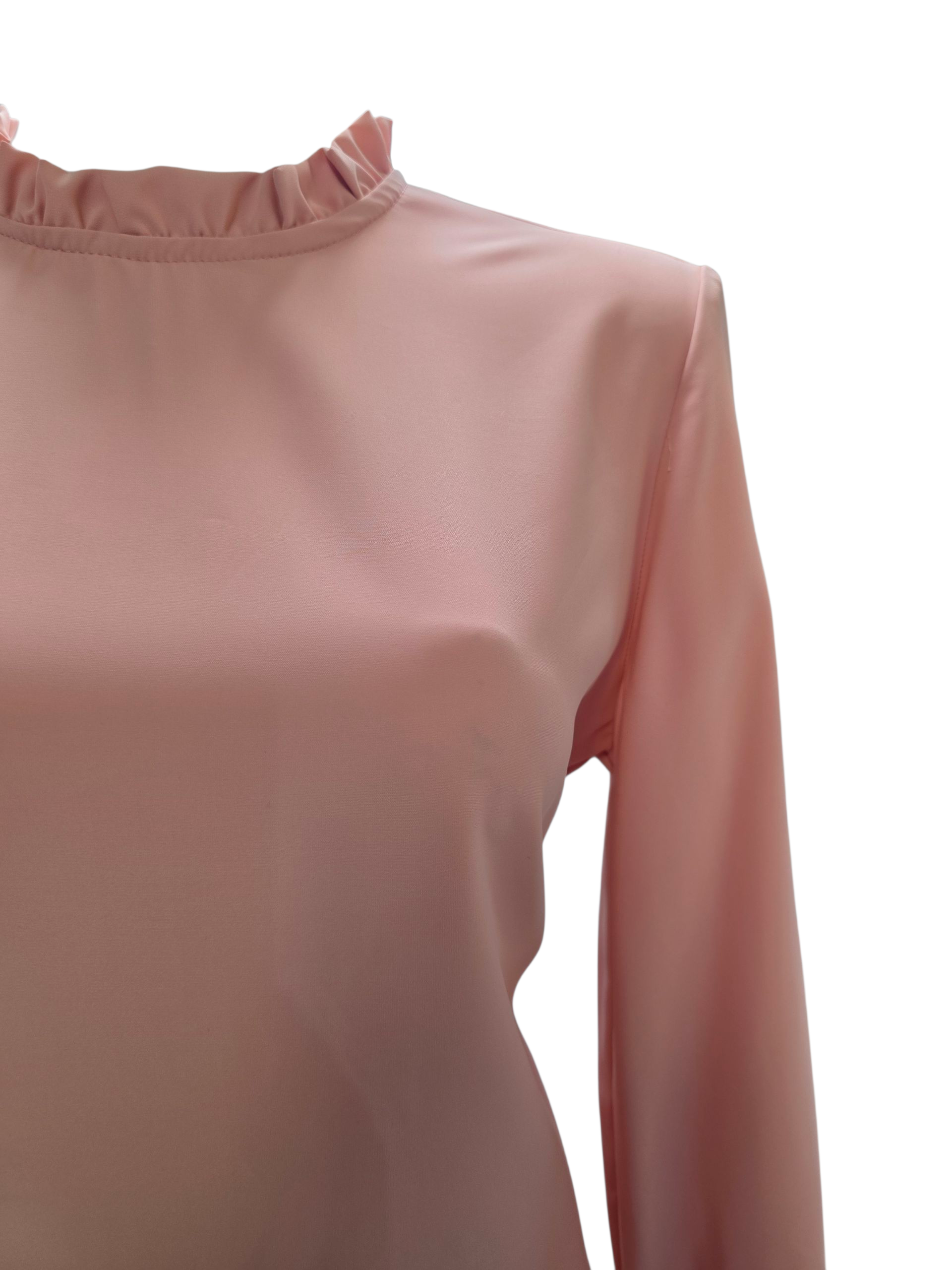Blusa de dama en color rosa , manga larga , cuello con olan y resorte en los puños