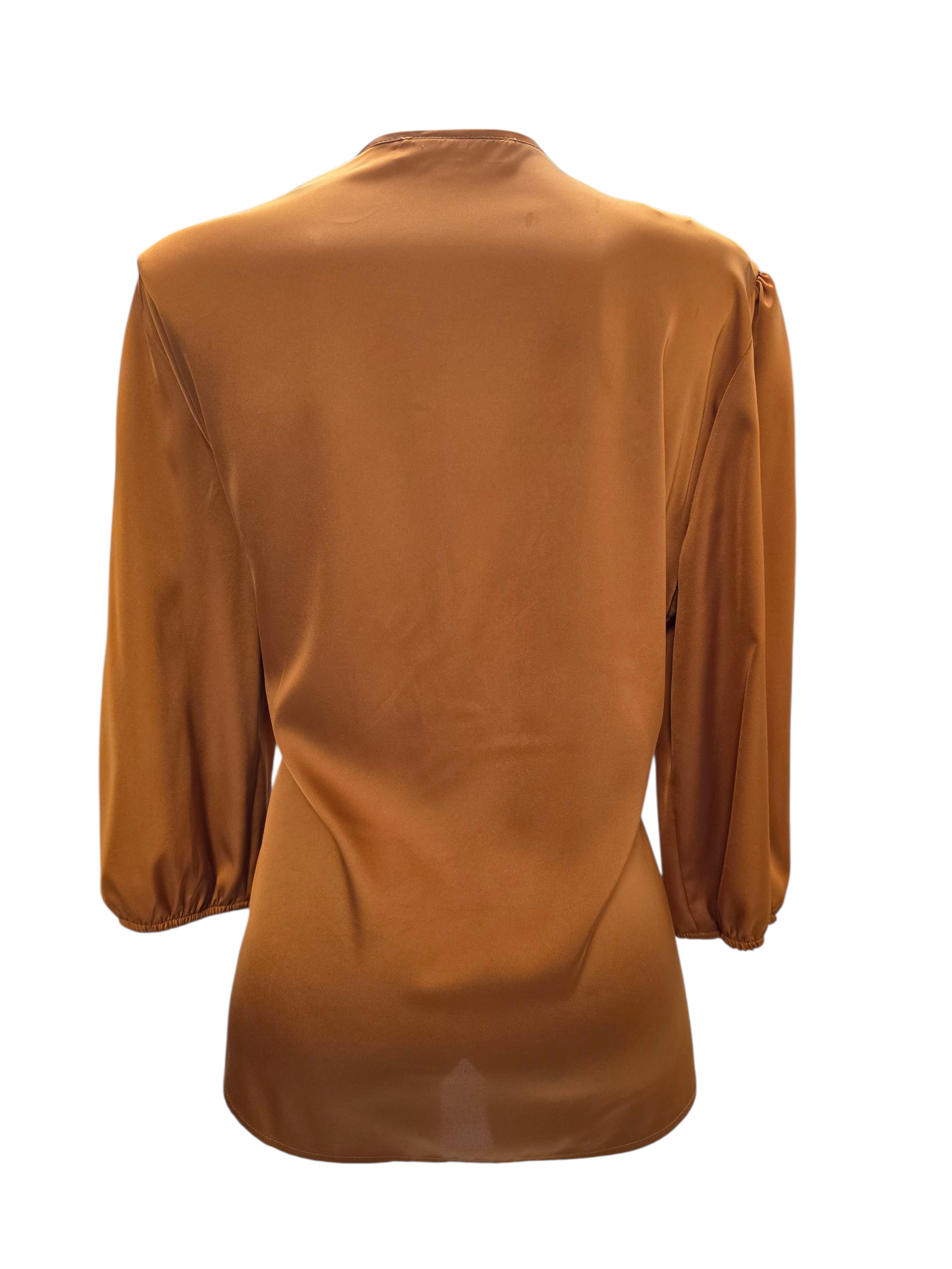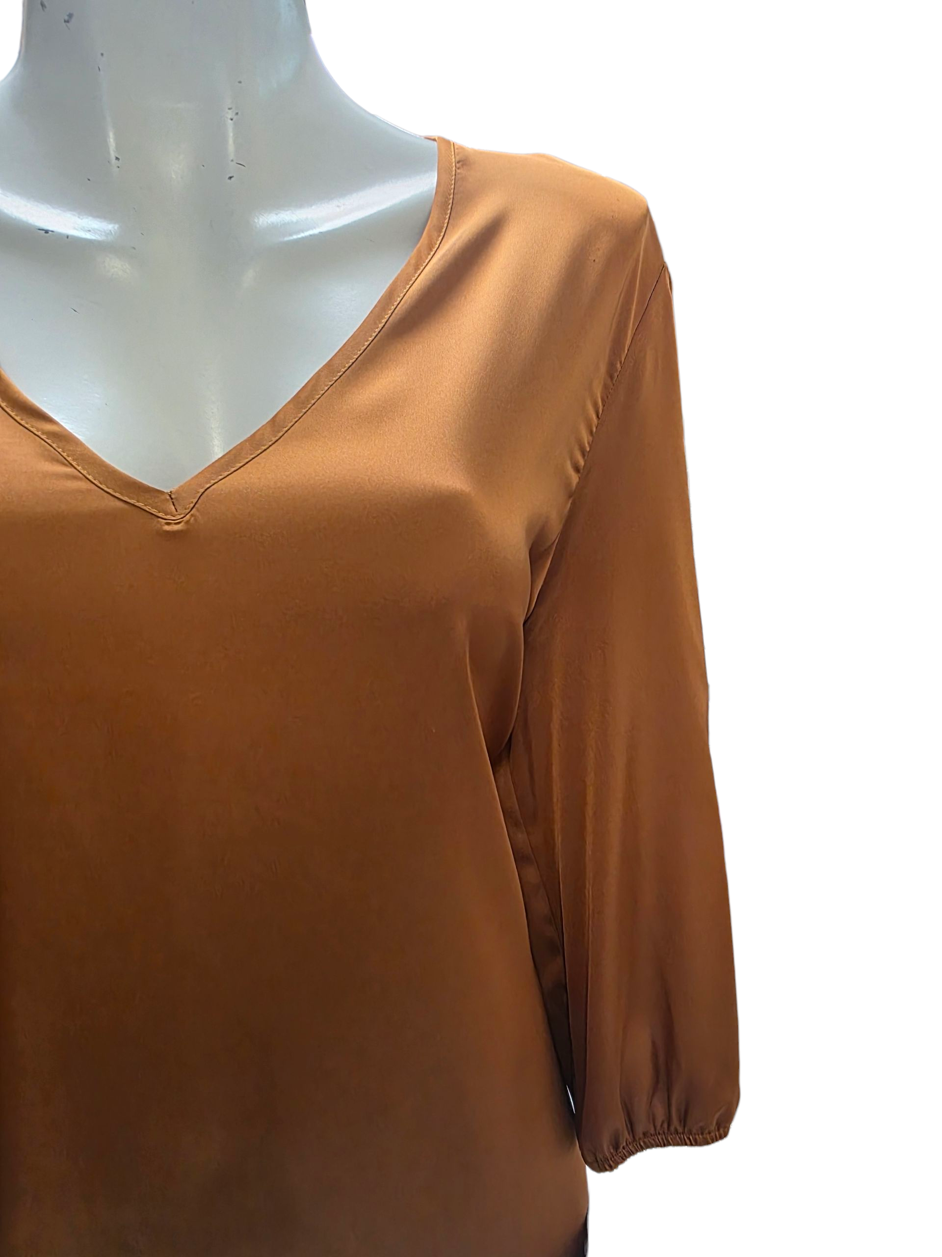 Blusa de dama en color coñac, manga larga con resorte en los puños y cuello V