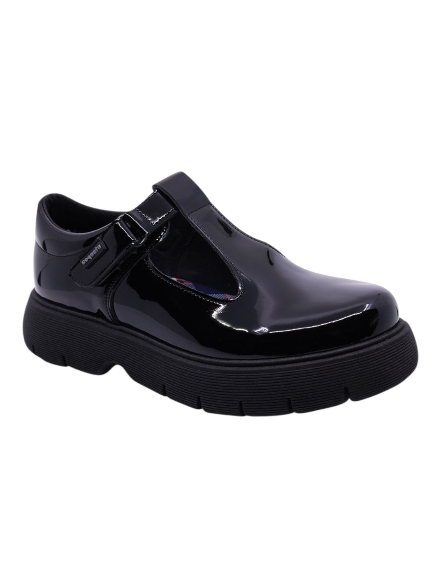 fabricado en charol negro, un material fácil de limpiar. Incluye una tira de contacto al frente tipo T que aporta un ajuste seguro y un diseño moderno. Su arco soporte mejora la postura y brinda estabilidad durante el día escolar.