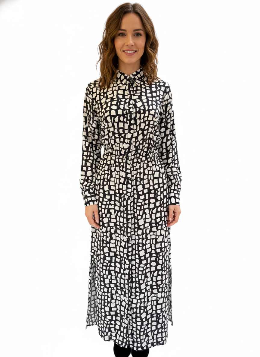 Vestido midi para dama en color negro con lunares blancos , botones hasta el cuello y resorte en la cintura.