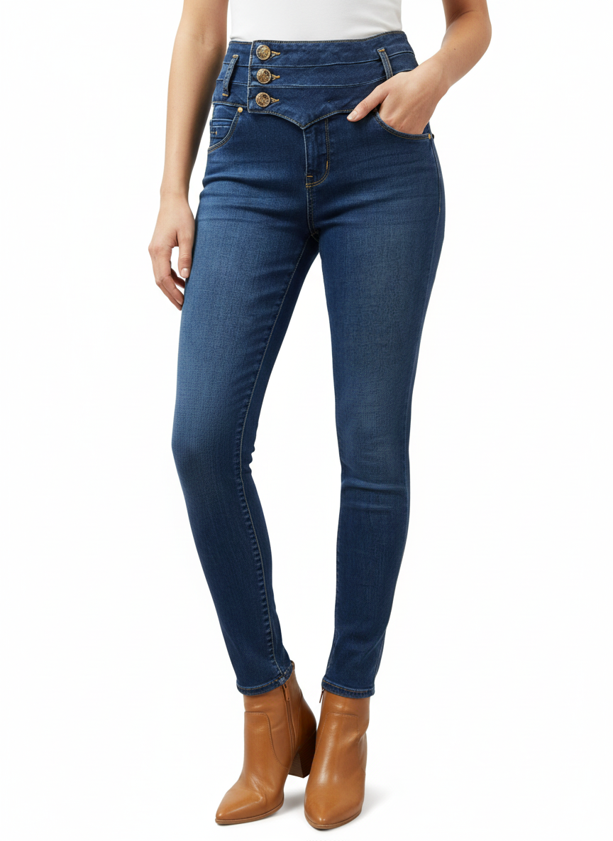 Pantalón para dama tiro alto, cuenta con tres botones para tener mayor ajuste, bolsillos traseros y pinzas levanta pompi.