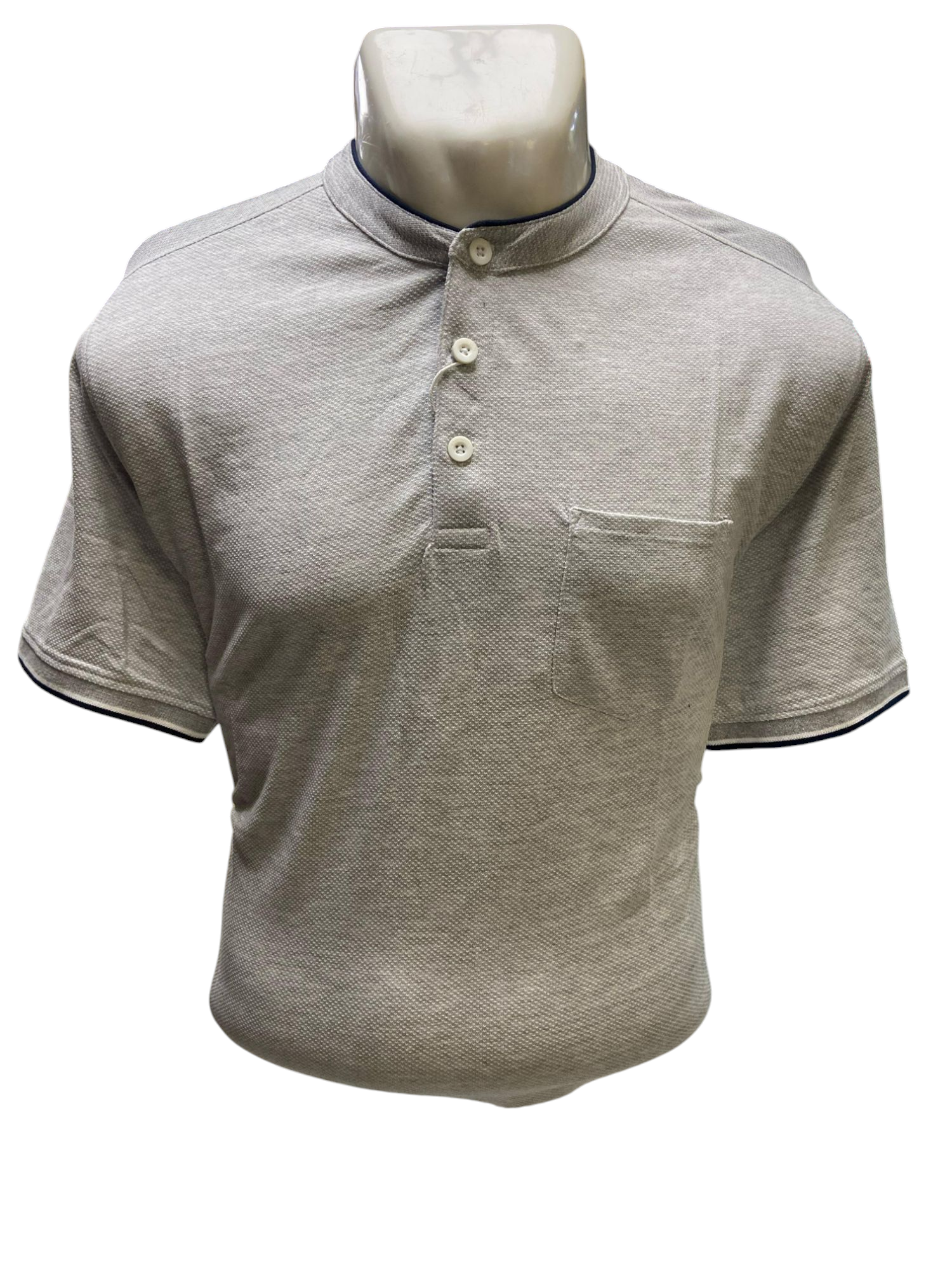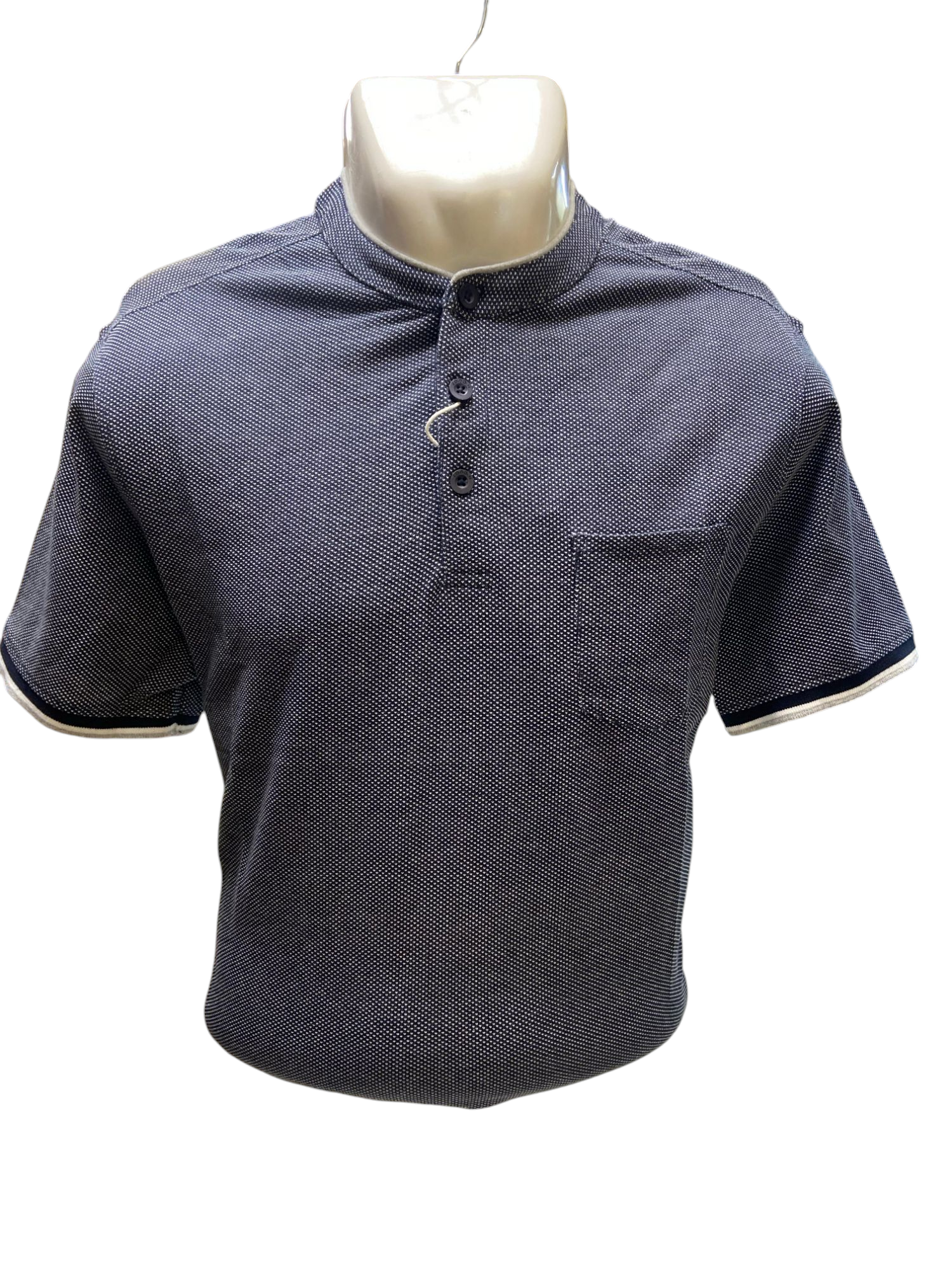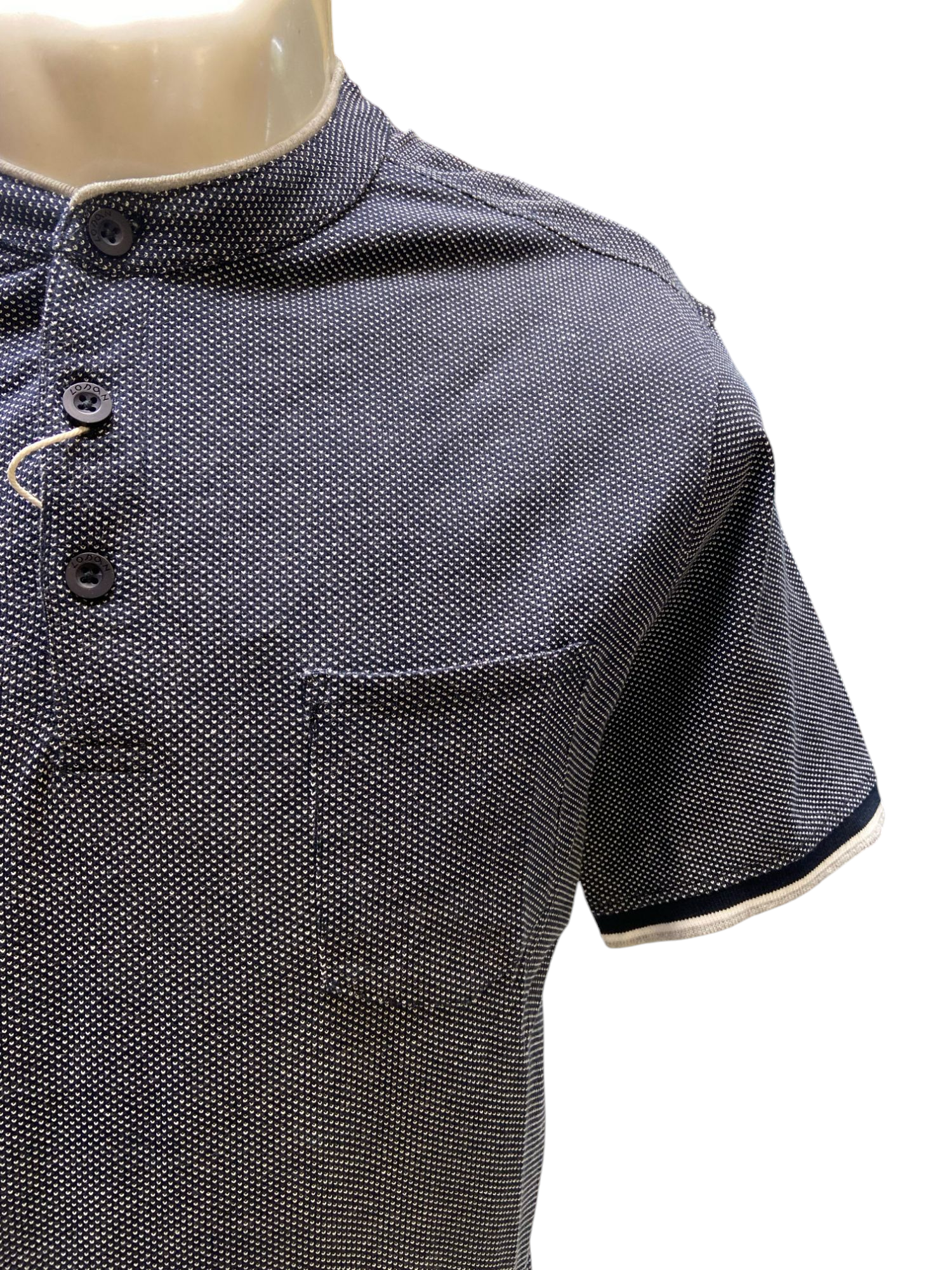 Playera para caballero con cuello Mao, manga corta y un bolsillo en el pecho.