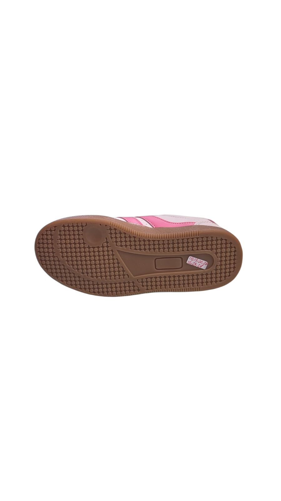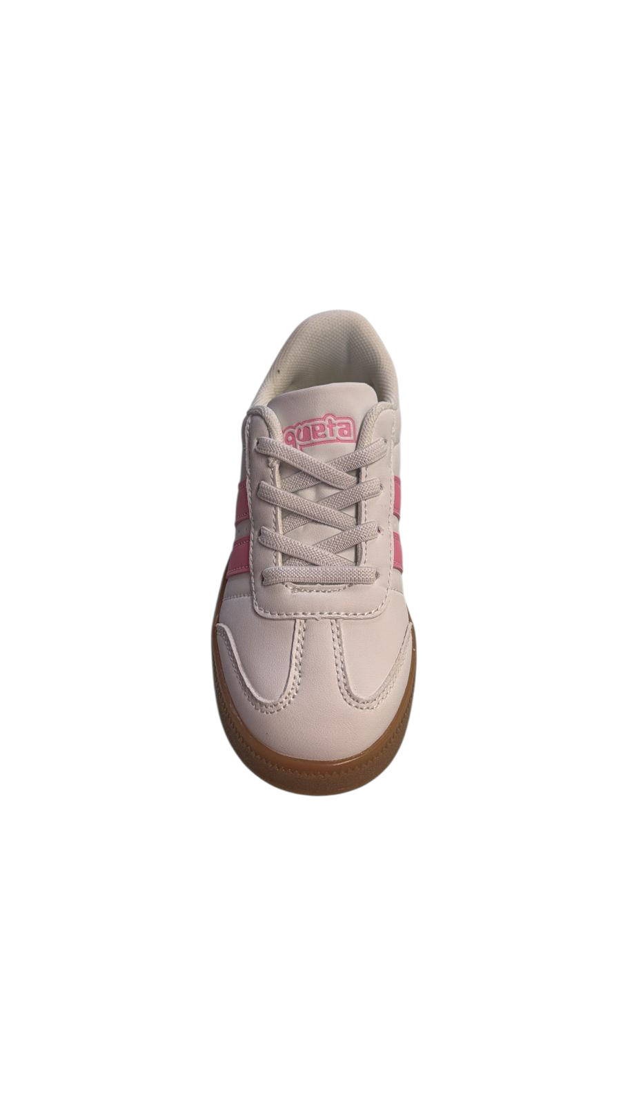 Tenis Coqueta blanco con franjas rosas y suela color miel que aporta estilo moderno y versátil. Fabricado en sintético con forro textil que brinda frescura y comodidad. Suela EVA ligera y resistente, con ajuste de agujetas que ofrece seguridad y firmeza en cada paso.