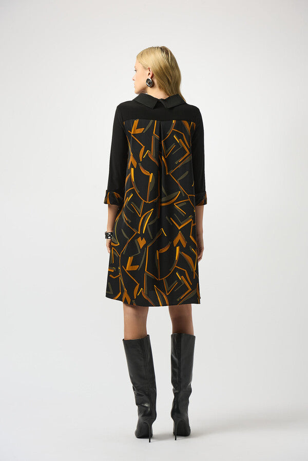 El vestido Joseph Ribkoff de corte A hasta la rodilla es perfecto para ocasiones informales y semiformales. Este vestido presenta un elegante cuello vuelto y un estampado abstracto que le da un toque moderno a un diseño clásico. Las mangas rectas 3/4 y los prácticos bolsillos realzan su practicidad, mientras que su estilo femenino te garantiza un look chic sin esfuerzo.