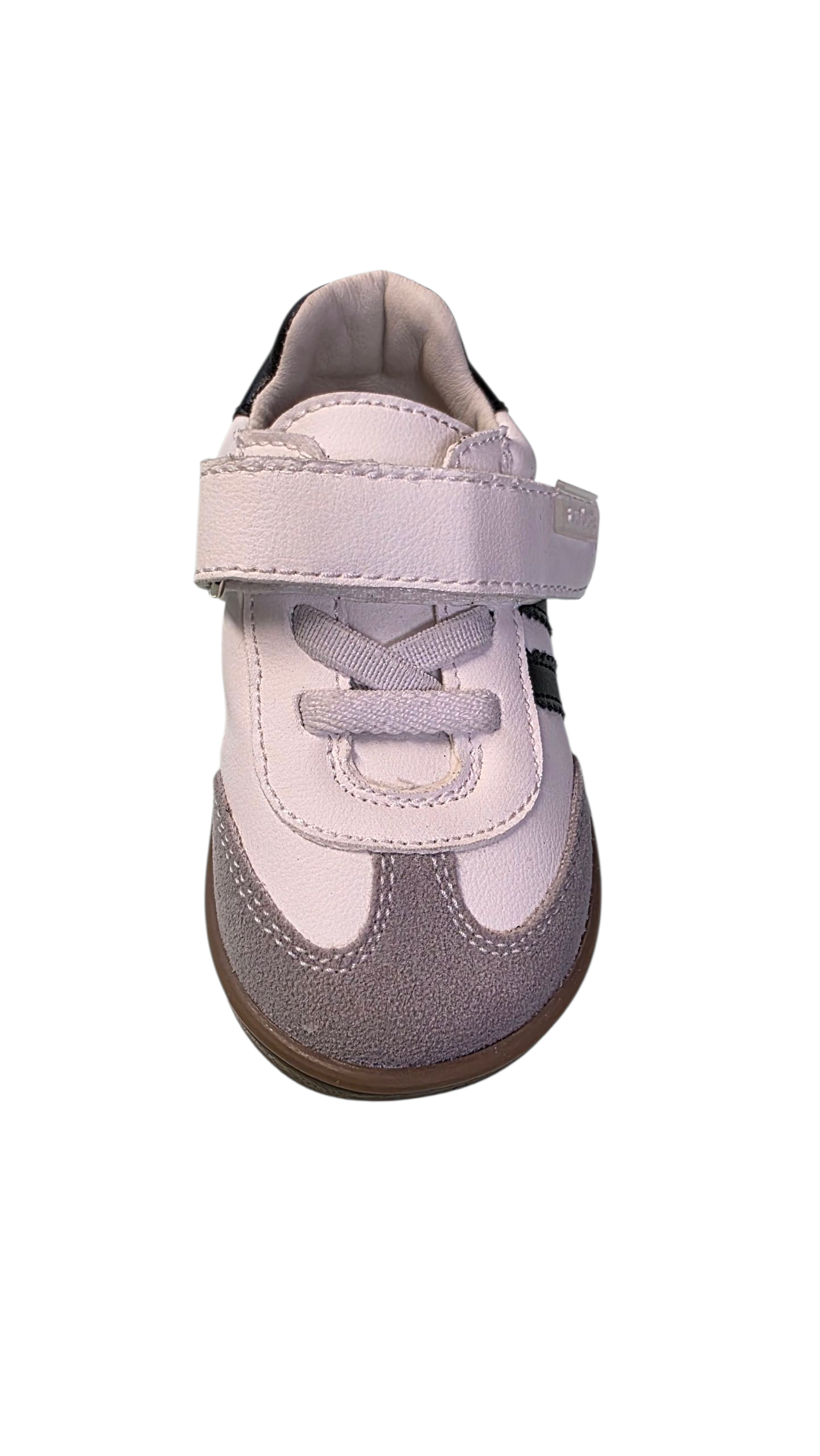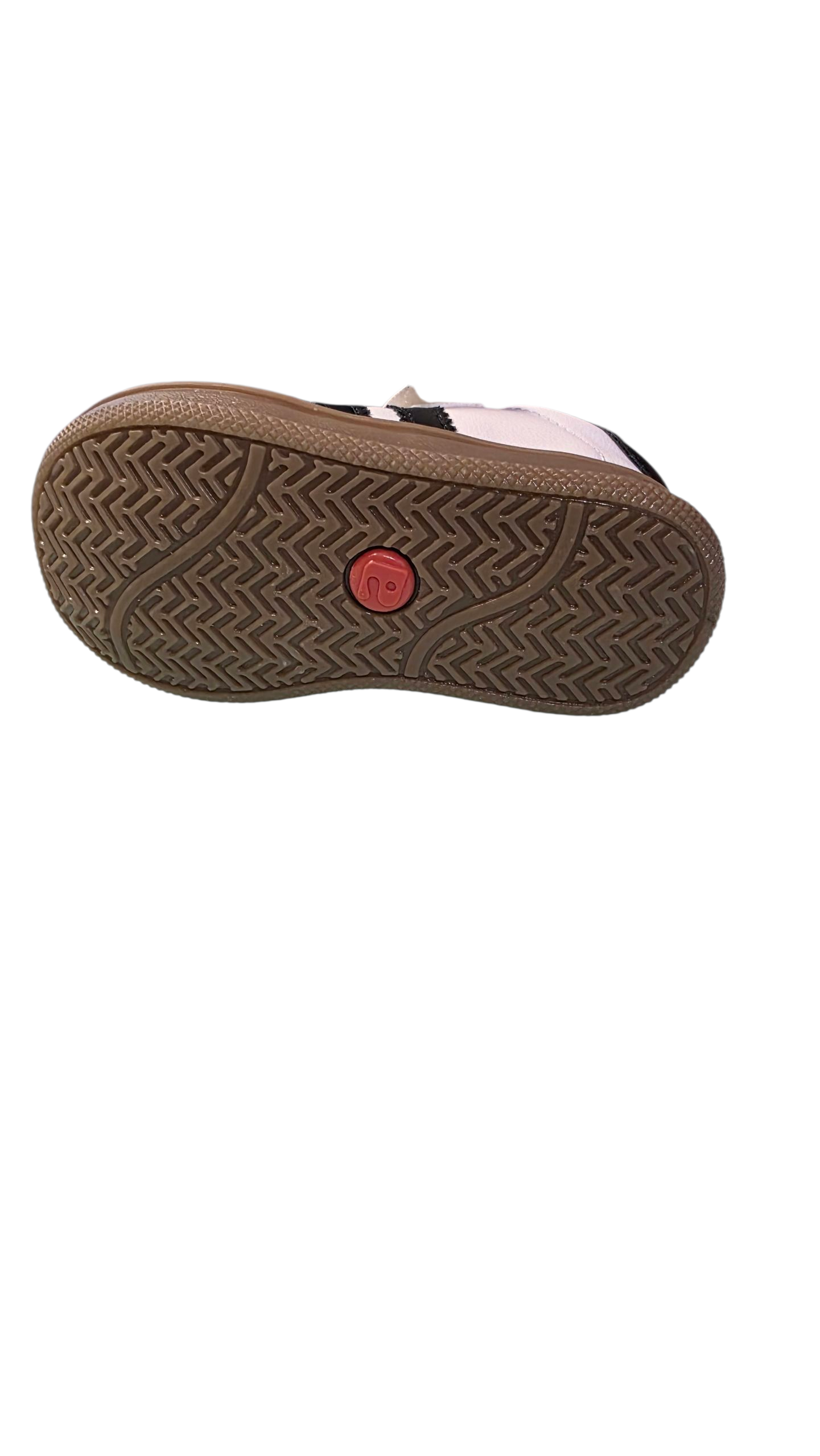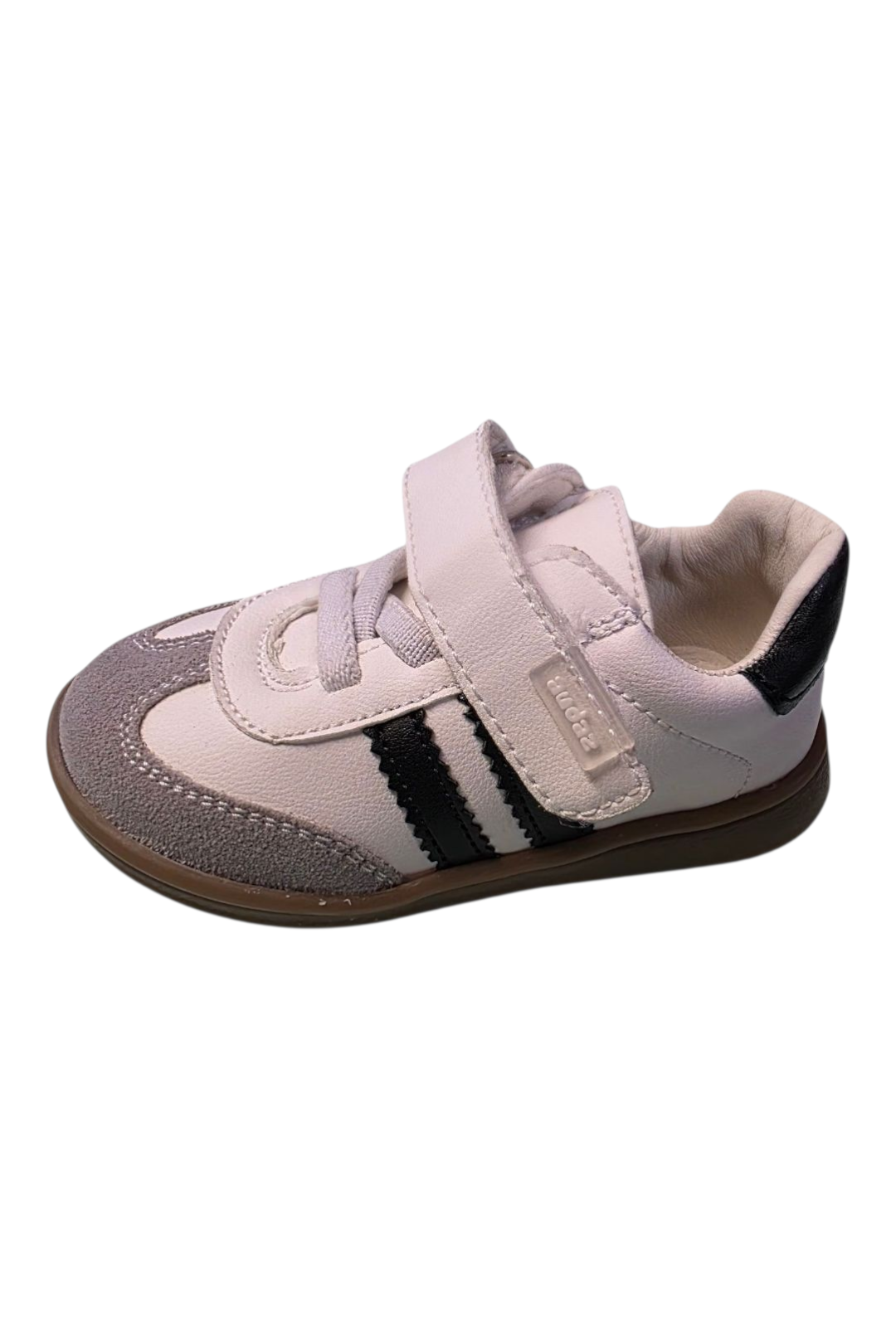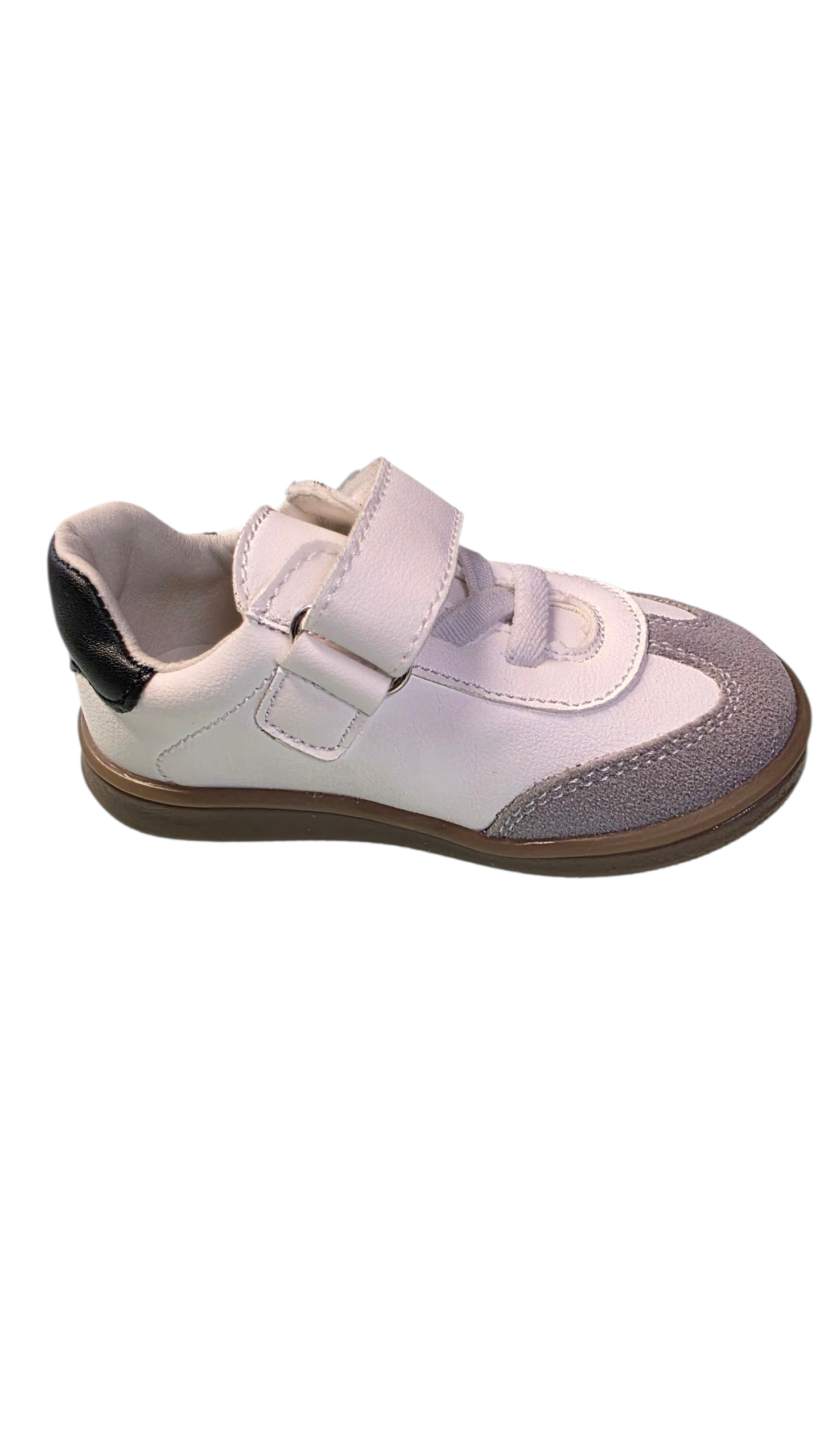 Este tenis blanco con detalles negros y gris claro es ideal para los primeros pasos de los más pequeños. Su diseño combina cordones elásticos con ajuste de velcro, brindando un calce seguro y práctico. El refuerzo en la puntera y el talón ofrece mayor durabilidad, mientras que la suela antiderrapante en tono caramelo proporciona tracción y estabilidad en cada paso.