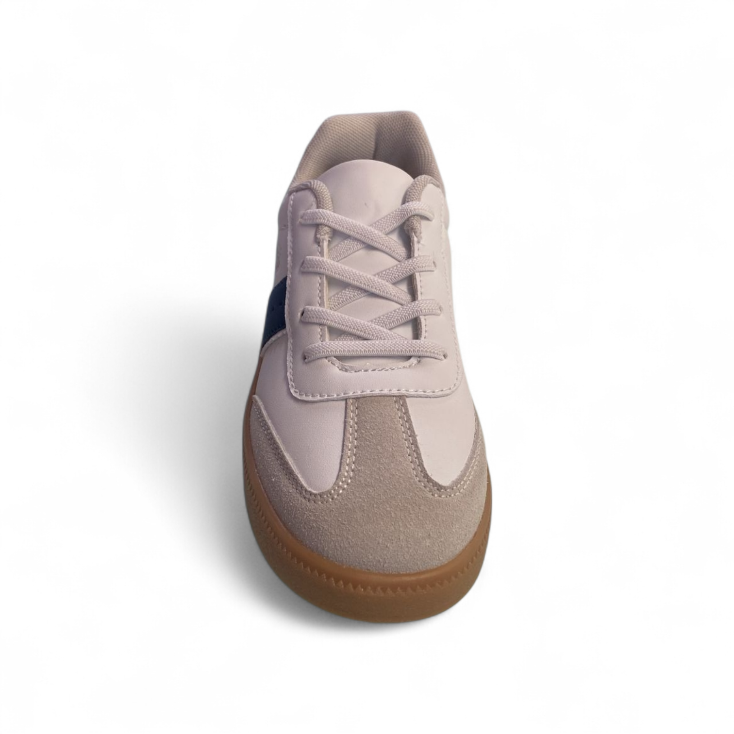 Tenis Audaz blanco con franjas azul marino y suela color miel, ideal para el uso diario. Elaborado en sintético con forro textil que brinda frescura, incorpora suela de EVA ligera y resistente. Ajuste con agujetas que ofrecen firmeza y comodidad en cada paso.