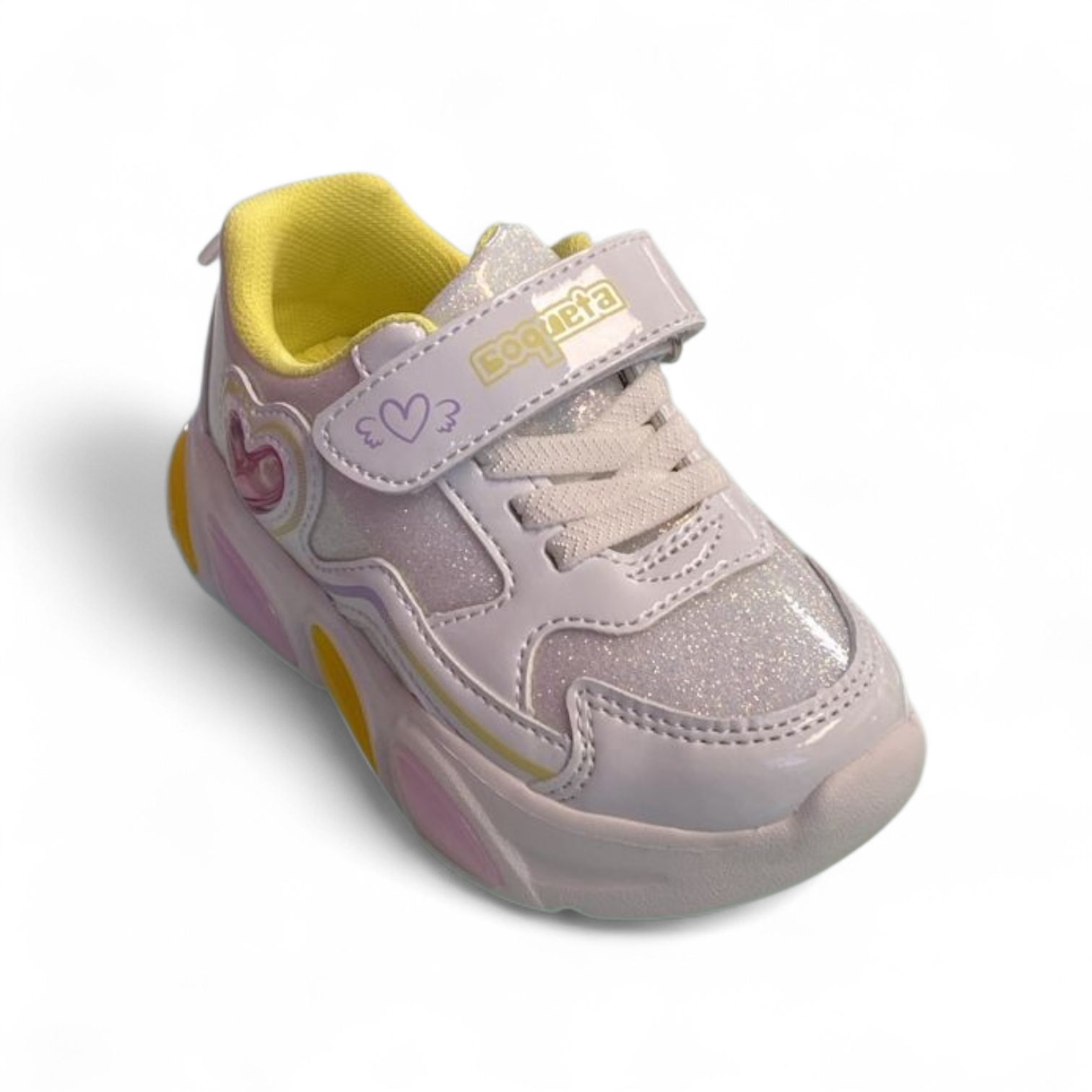 Tenis Coqueta blanco Bulma multicolor y detalle de corazón lateral que lo hacen divertido y moderno. Fabricado en sintético resistente con forro textil que brinda frescura. Suela EVA ligera y amortiguada que asegura confort, con ajuste de tira de contacto práctico y seguro.