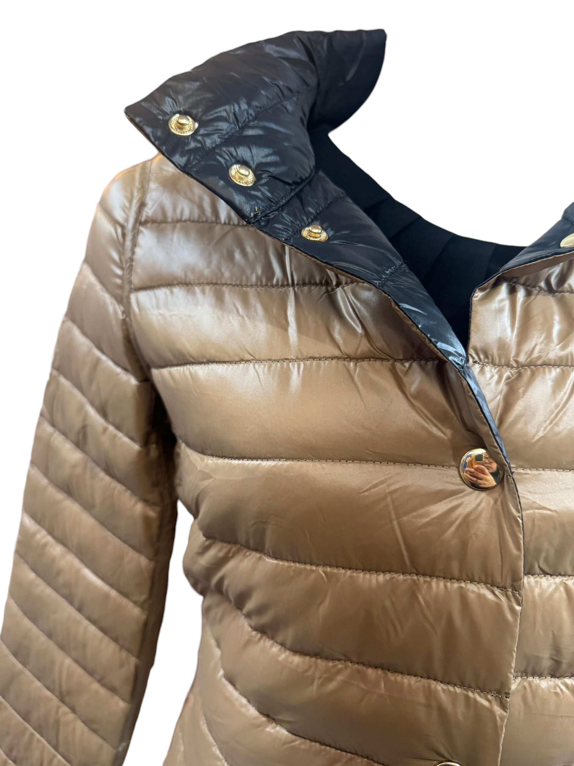 Chamarra doble vista para dama , color café y negro, con botones en todo el frente y bolsas a los costados