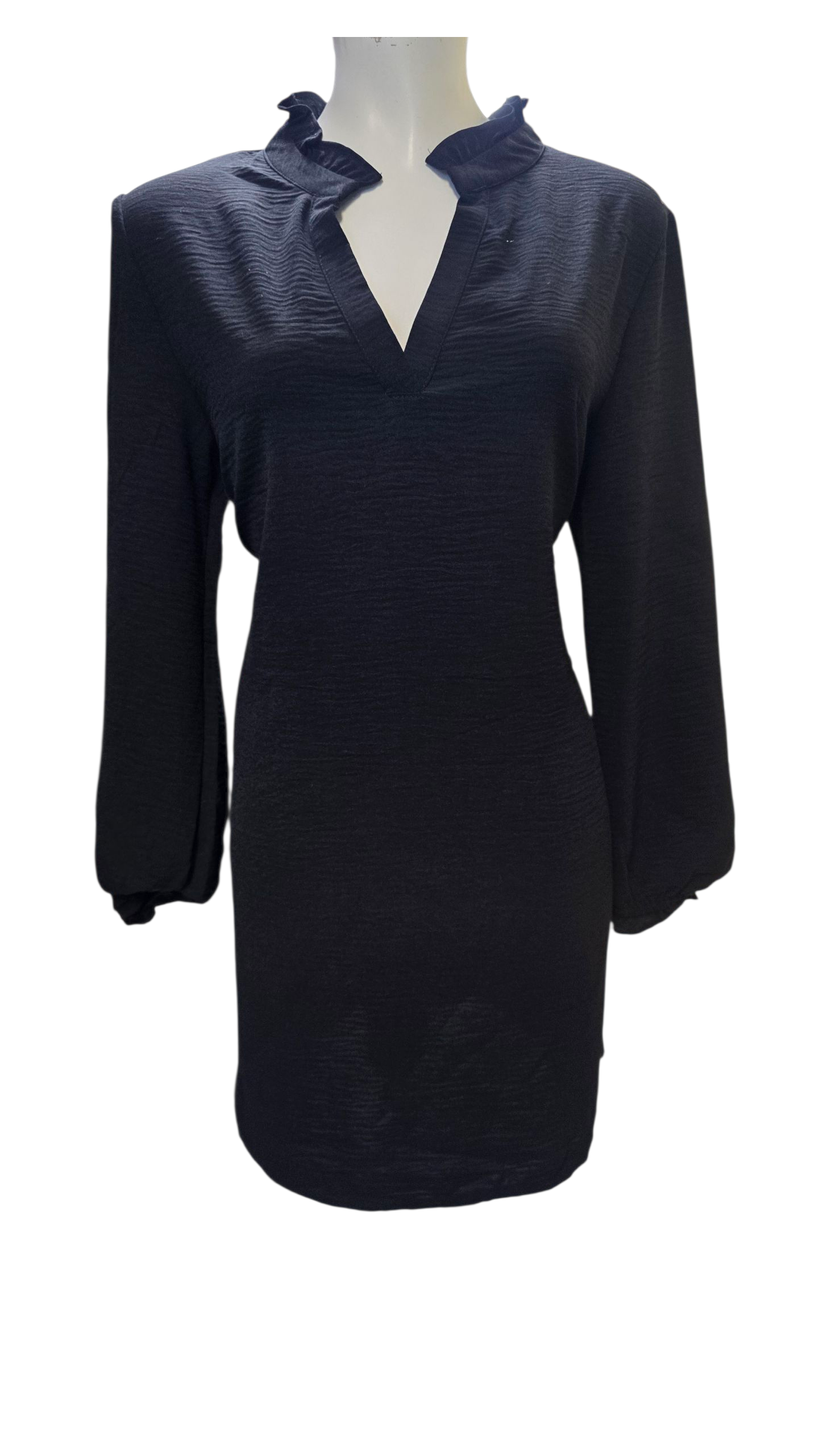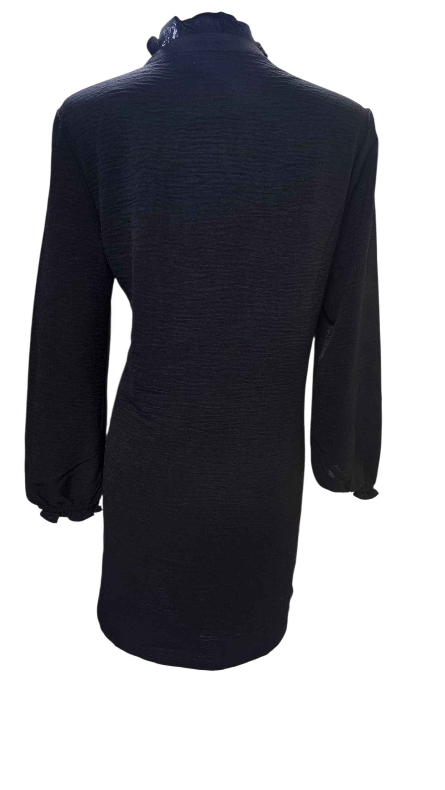 Vestido para dama en color negro, con cuello V y cuello alto fruncido, manga larga con resorte en los puños