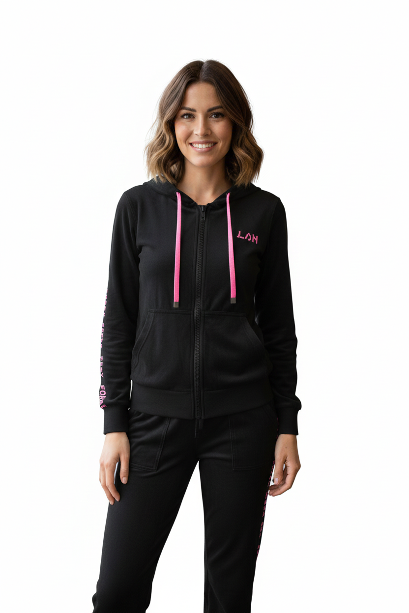 Conjunto deportivo con chamarra con gorro de corte regular en tejido liso color negro con detalles en las mangas color rosa fosforescente, cierre de cremallera a tono, logotipo de la marca, sin bolsillos.