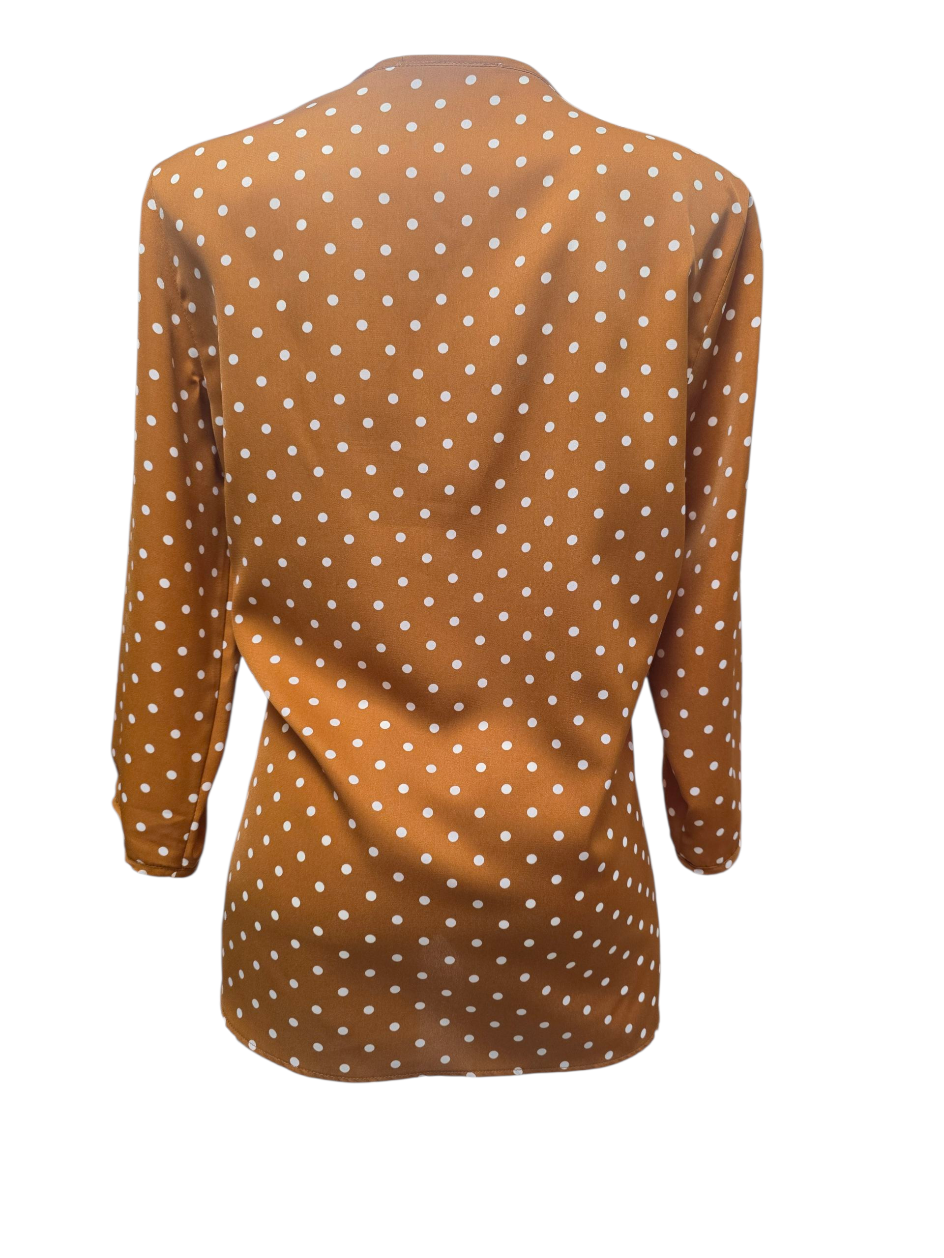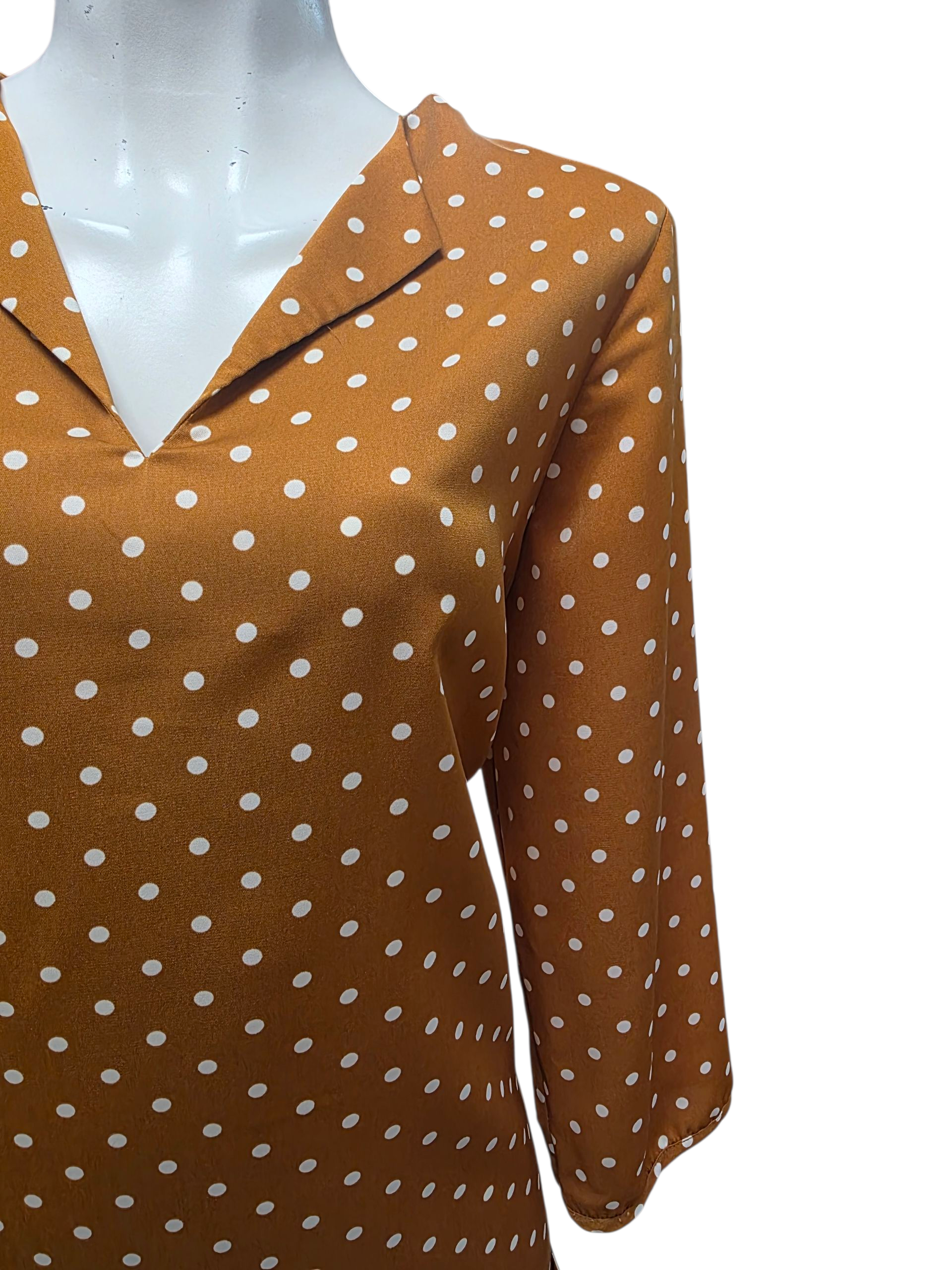 Blusa de dama en color mostaza con puntos blancos , con cuello V y manga larga.