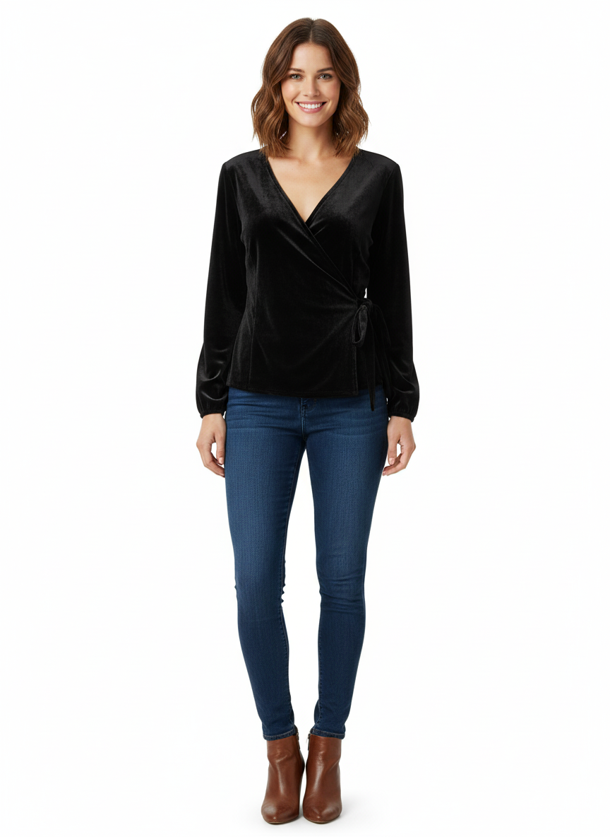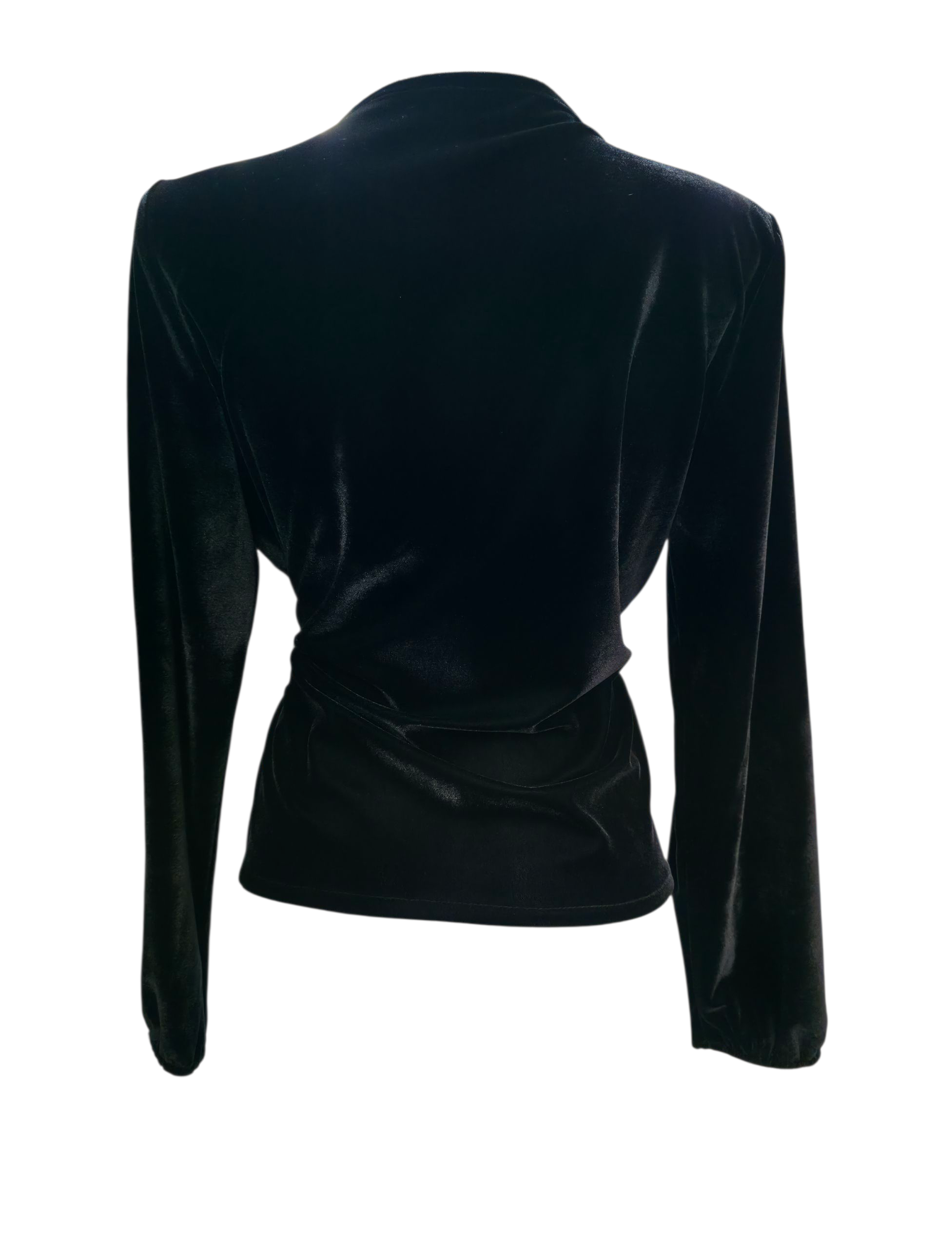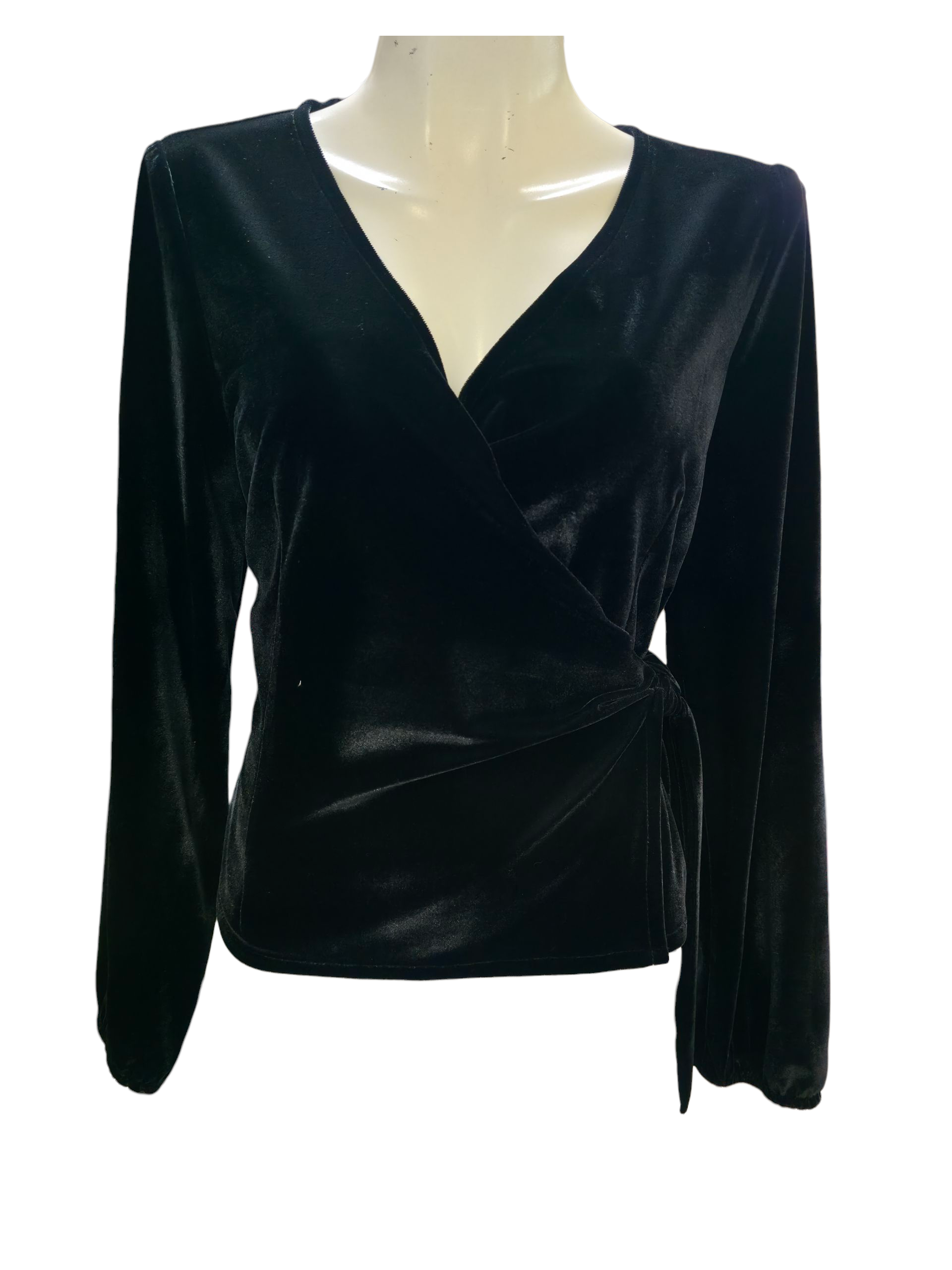 Blusa de dama, efwcto terciopelo, con cuello Vy manga larga, con cruce hacia la cintura