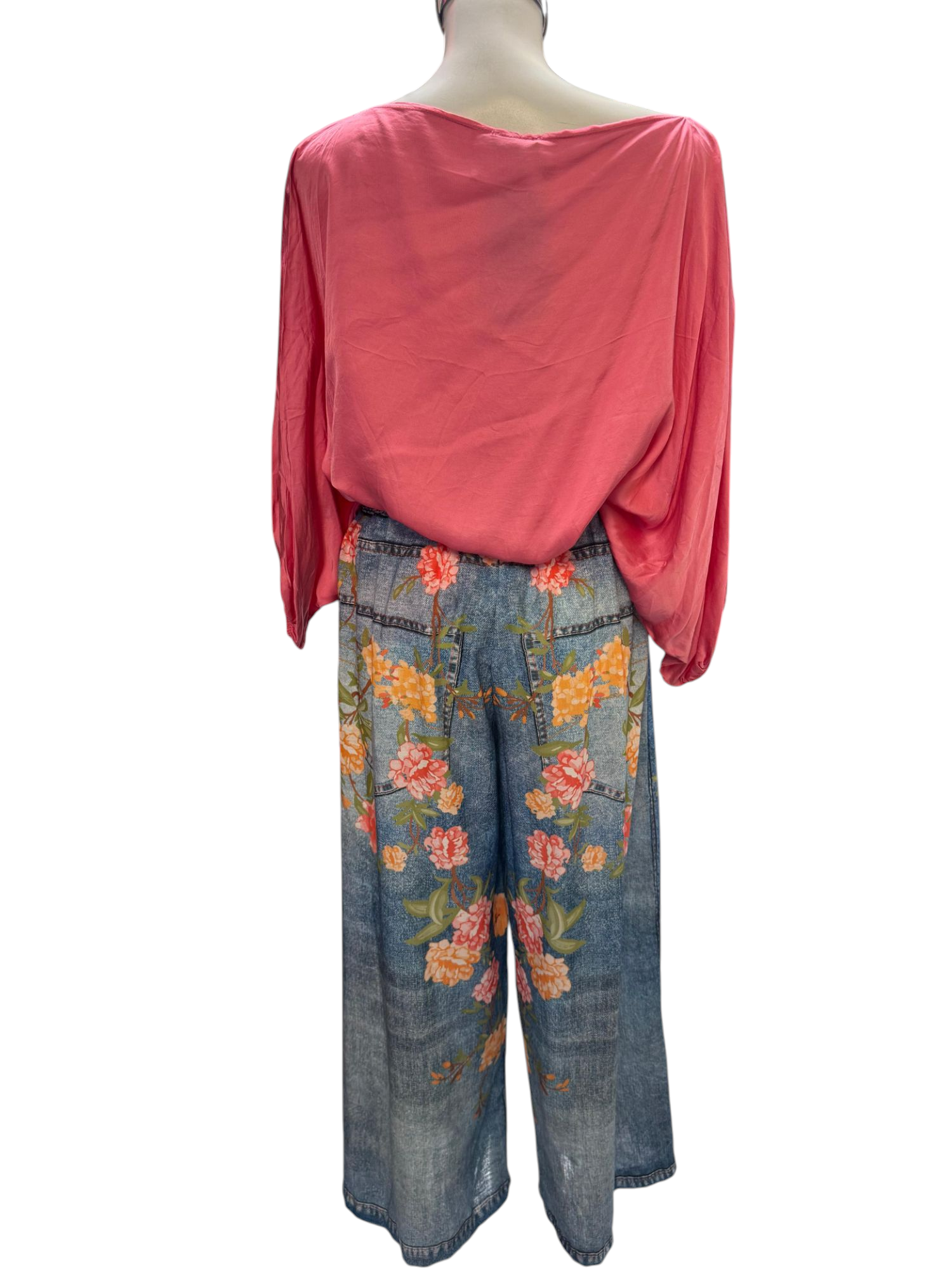 Conjunto para dama con blusa lisa , cuello alto y manga larga, pantalón ligero , color mezclilla con detalles de flores