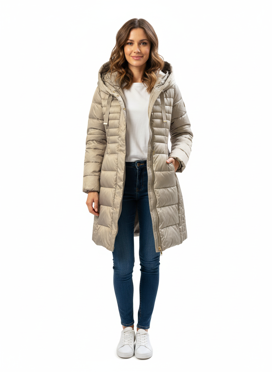 Chamarra importada larga para dama, cuenta con cierre adicional más pequeño en la parte interior , cintas en la capucha para ajuste y bolsillos a los costados.