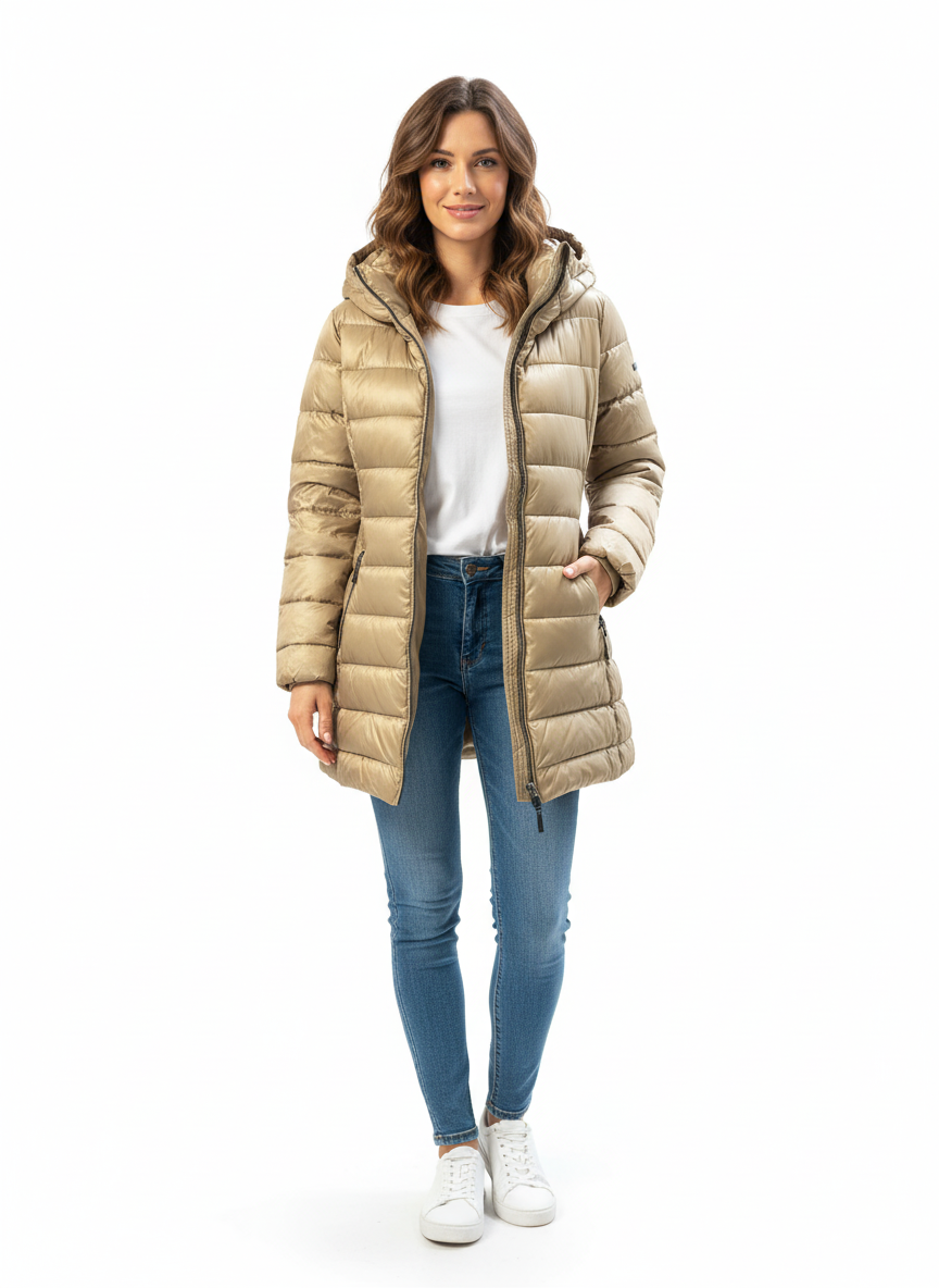 Chamarra importada para dama con cierre adicional en la parte interior, bolsillos a los costados, resorte en la cintura por la parte de atrás y capucha.