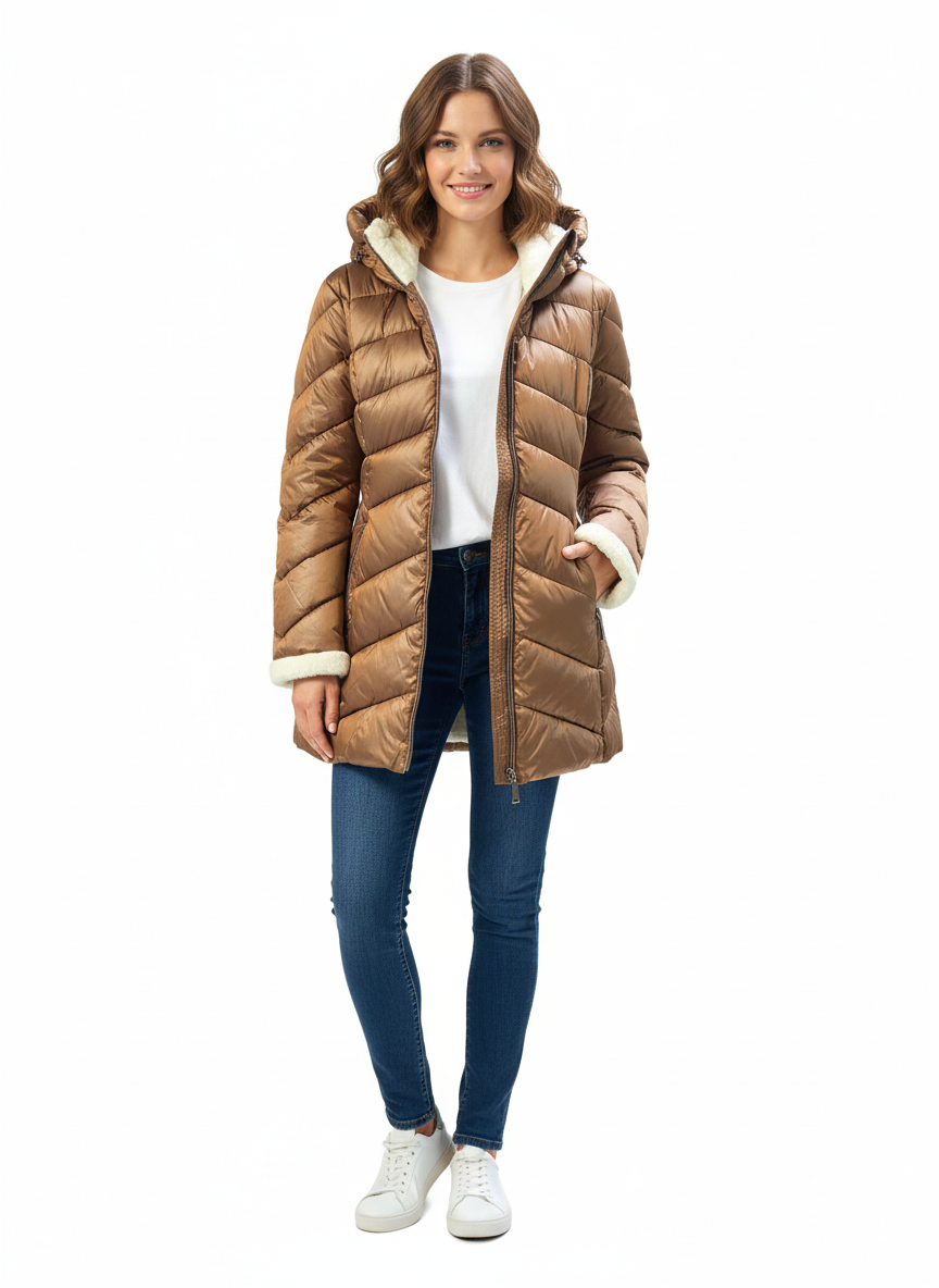 Chamarra importada para dama con afelpado en la parte exterior , visible también en las mangas; gorro y bolillos a los costados.