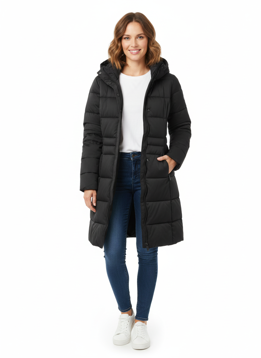 Chamarra larga importada para dama con cierre oculto en todo el frente , gorro, bolsillos a los costados y resorte en la parte de la cintura .